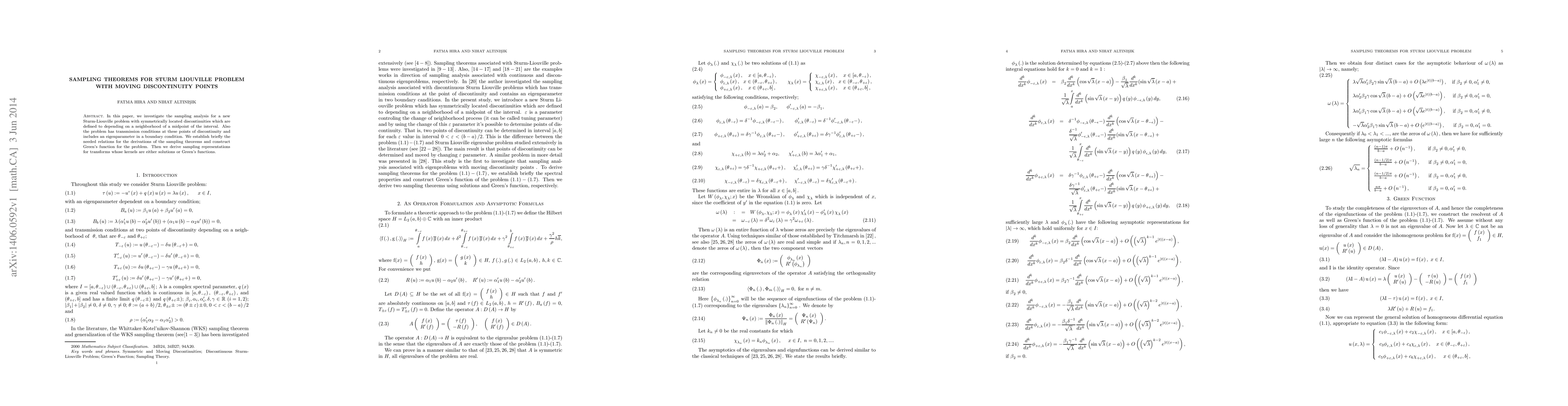 This paper explores sampling theorems for a Sturm-Liouville problem featuring symmetrically located moving discontinuities and transmission conditions. It constructs Green's functions and derives sampling representations for associated transforms.