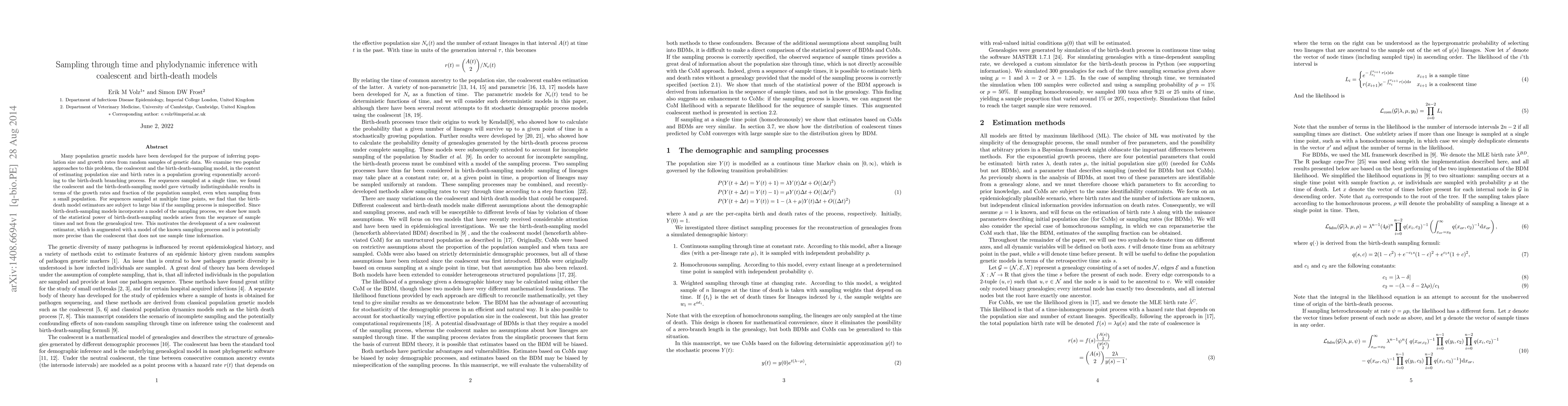 This paper compares coalescent and birth-death-sampling models for estimating population size and growth rates from genetic data, finding both give similar results for single-time samples. For multi-time samples, birth-death models show bias if sampling is misspecified, highlighting the importance of sample time information, which leads to the development of a new, more precise coalescent estimator incorporating sampling process details.