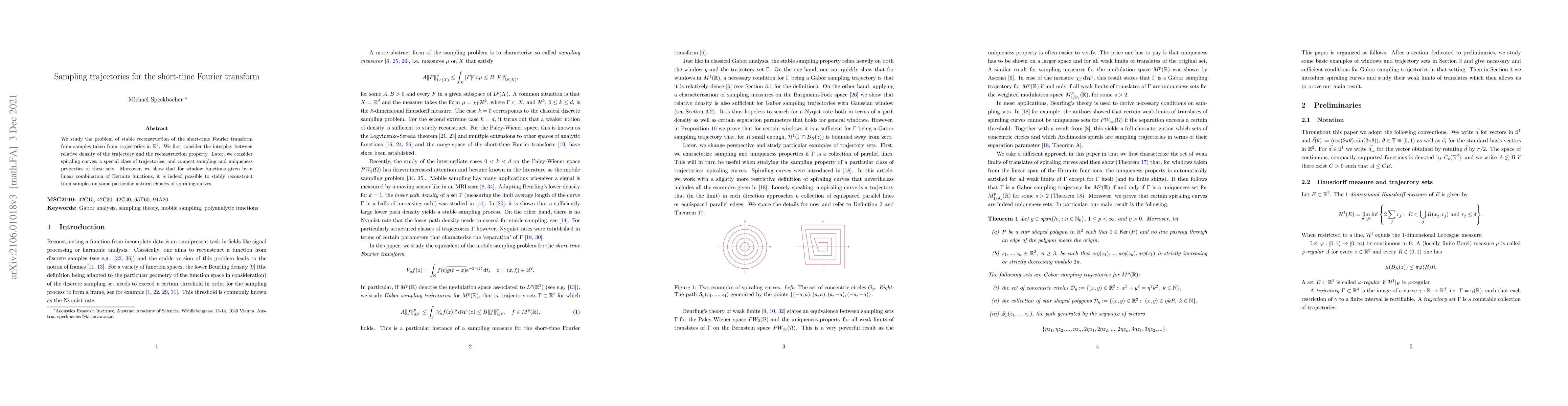 This paper investigates the reconstruction of the short-time Fourier transform from samples along trajectories in $\R^2$, focusing on the relationship between trajectory density and reconstruction properties. It demonstrates the feasibility of stable reconstruction using specific spiraling curves and linear combinations of Hermite functions.