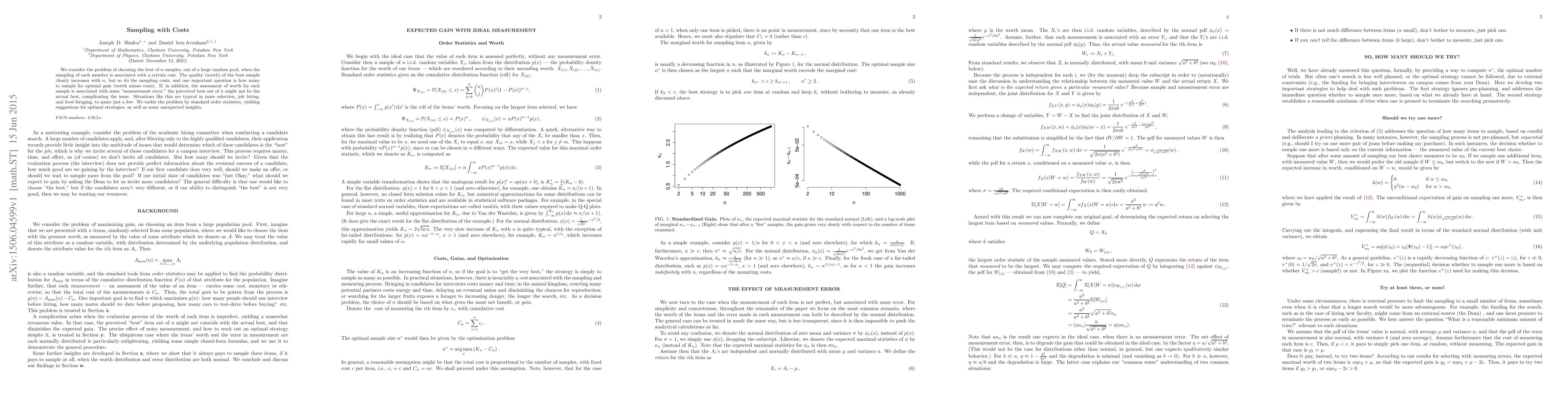 We consider the problem of choosing the best of $n$ samples, out of a large random pool, when the sampling of each member is associated with a certain cost. The quality (worth) of the best sample clearly increases with $n$, but so do the sampling costs, and one important question is how many to sample for optimal gain (worth minus costs). If, in addition, the assessment of worth for each sample is associated with some "measurement error," the perceived best out of $n$ might not be the actual best, complicating the issue. Situations like this are typical in mate selection, job hiring, and food foraging, to name just a few. We tackle the problem by standard order statistics, yielding suggestions for optimal strategies, as well as some unexpected insights.