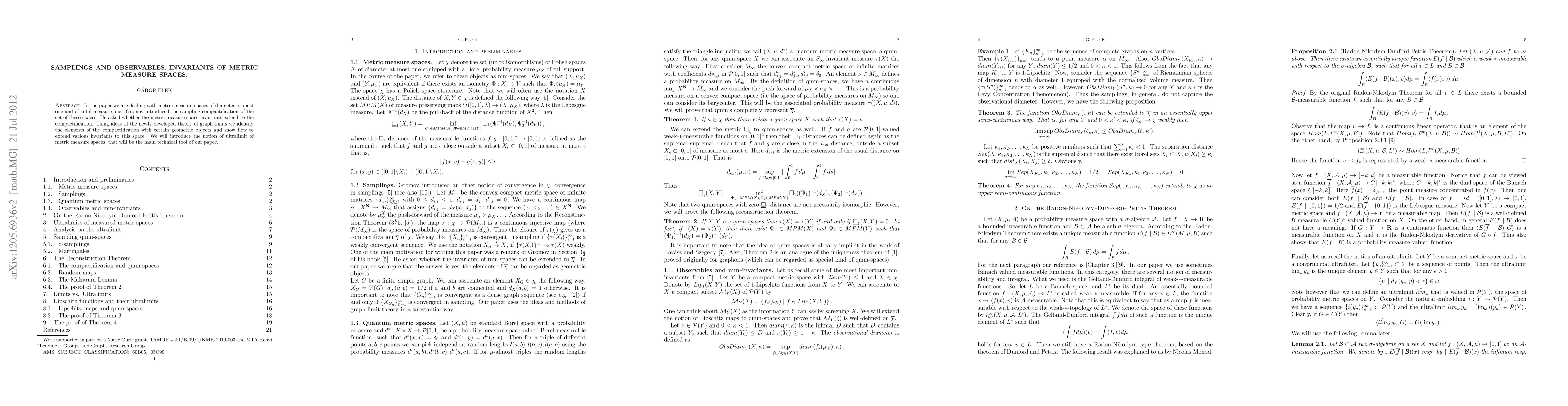 This paper explores metric measure spaces with diameter and total measure constraints, investigating whether invariants extend to Gromov's sampling compactification. Utilizing graph limits theory, the authors identify compactification elements with geometric objects and introduce the ultralimit of metric measure spaces as a key tool for extending these invariants.
