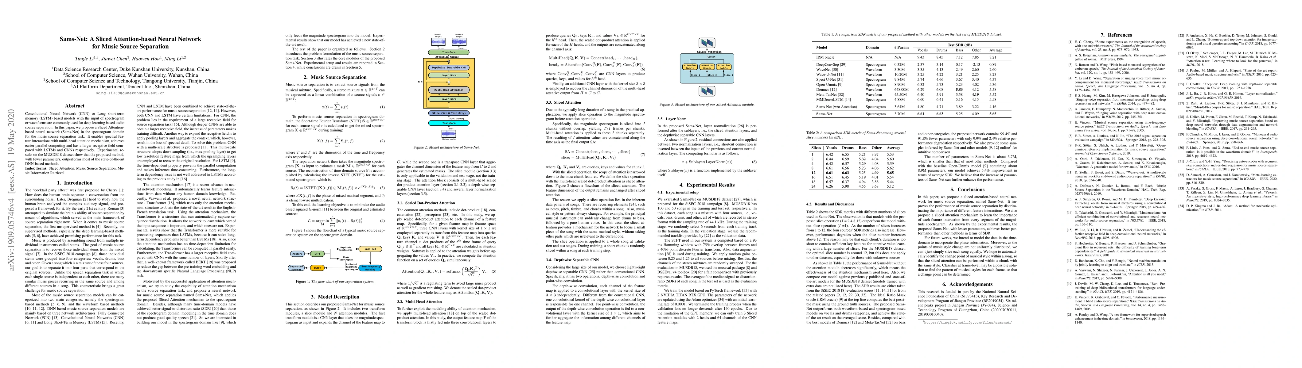 Sams-Net is a sliced attention-based neural network designed for music source separation, leveraging spectral feature interactions and multi-head attention for enhanced performance. It outperforms state-of-the-art DNN-based methods on the MUSDB18 dataset with fewer parameters.