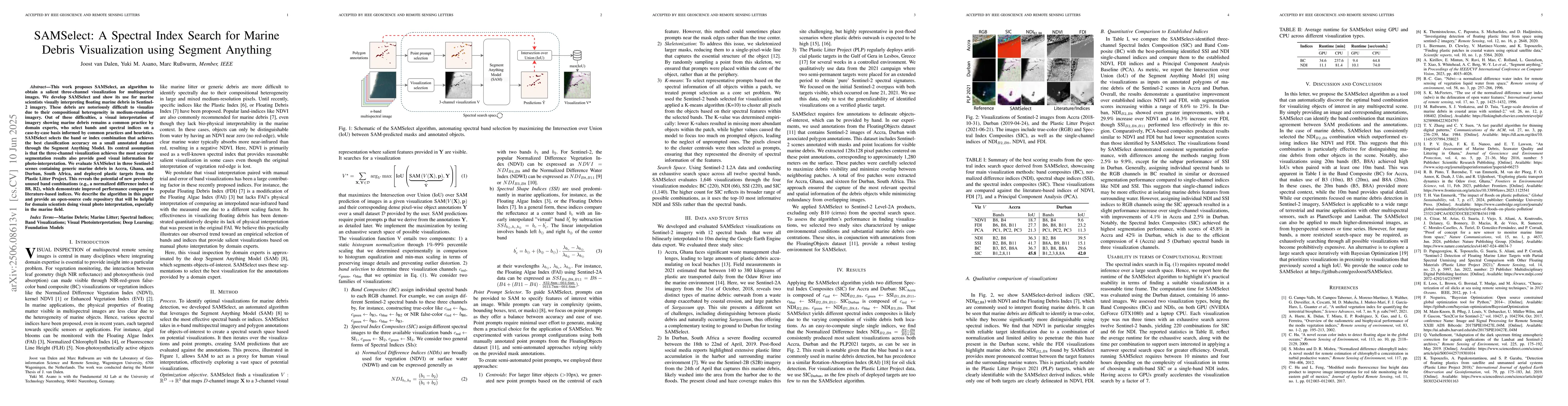 This paper introduces SAMSelect, an algorithm that enhances visualization of marine debris in medium-resolution imagery using the Segment Anything Model. It identifies optimal band combinations for accurate classification and interpretation, outperforming traditional indices. The method is evaluated with Sentinel-2 scenes in Ghana and South Africa, demonstrating improved debris detection and offering an open-source code repository for domain scientists.