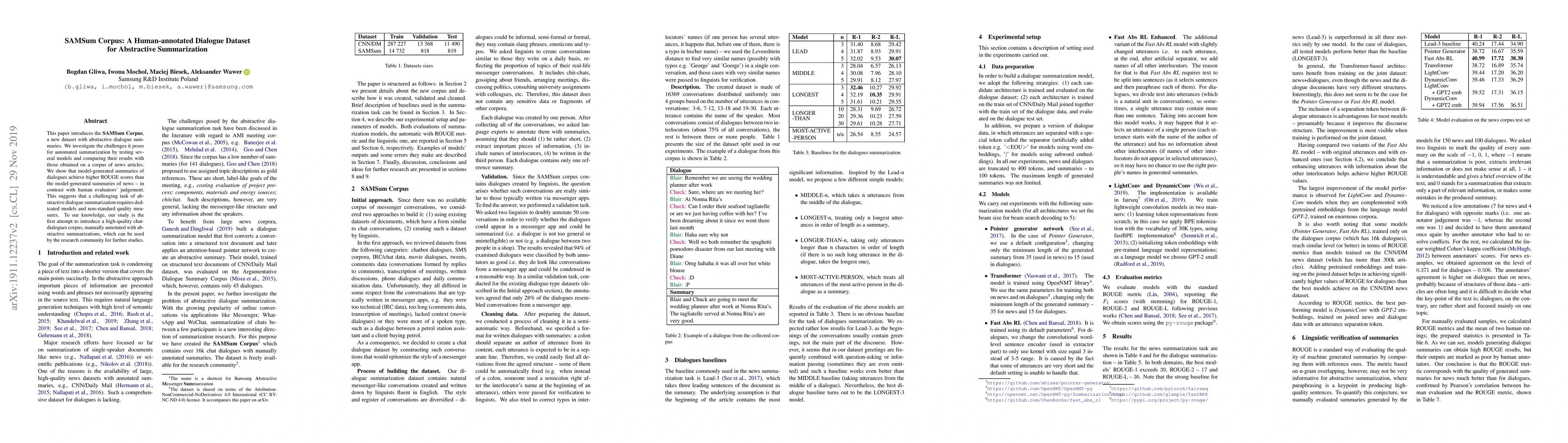 The SAMSum Corpus introduces a new dataset for abstractive dialogue summarization, revealing that automated models perform better on dialogues than news, contrary to human evaluations, indicating the need for specialized models and measures. This study is the first to provide a manually annotated chat-dialogues corpus for research in abstractive summarization.