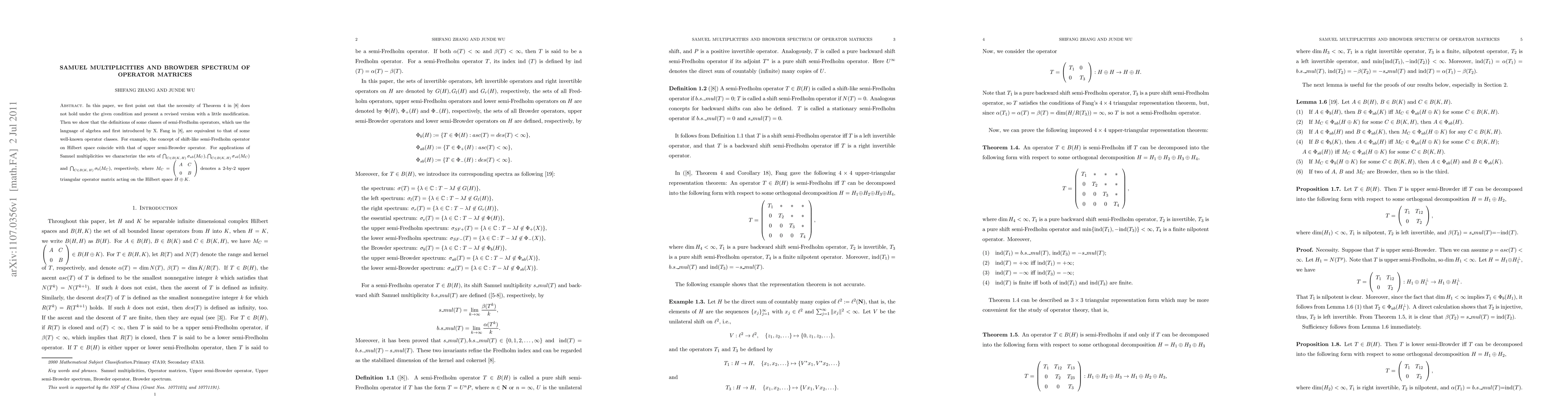 This paper demonstrates the equivalence between newly defined classes of semi-Fredholm operators introduced by X. Fang and established operator classes. It also applies Samuel multiplicities to characterize specific sets of the Browder spectrum for operator matrices.