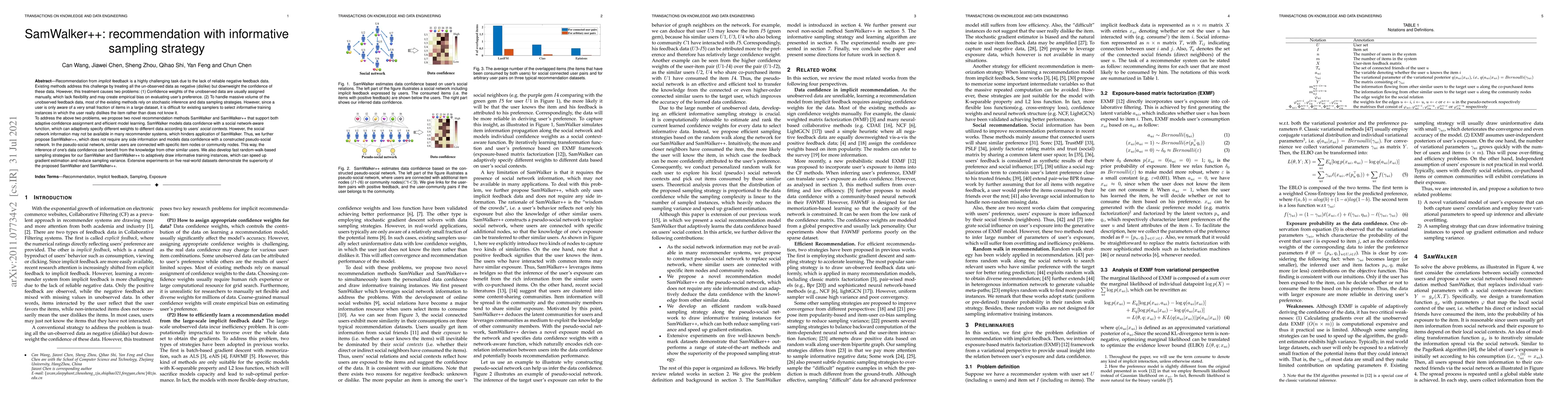 Recommendation from implicit feedback is a highly challenging task due to the lack of reliable negative feedback data. Existing methods address this challenge by treating all the un-observed data as negative (dislike) but downweight the confidence of these data. However, this treatment causes two problems: (1) Confidence weights of the unobserved data are usually assigned manually, which lack flexibility and may create empirical bias on evaluating user's preference. (2) To handle massive volume of the unobserved feedback data, most of the existing methods rely on stochastic inference and data sampling strategies. However, since a user is only aware of a very small fraction of items in a large dataset, it is difficult for existing samplers to select informative training instances in which the user really dislikes the item rather than does not know it. To address the above two problems, we propose two novel recommendation methods SamWalker and SamWalker++ that support both adaptive confidence assignment and efficient model learning. SamWalker models data confidence with a social network-aware function, which can adaptively specify different weights to different data according to users' social contexts. However, the social network information may not be available in many recommender systems, which hinders application of SamWalker. Thus, we further propose SamWalker++, which does not require any side information and models data confidence with a constructed pseudo-social network. We also develop fast random-walk-based sampling strategies for our SamWalker and SamWalker++ to adaptively draw informative training instances, which can speed up gradient estimation and reduce sampling variance. Extensive experiments on five real-world datasets demonstrate the superiority of the proposed SamWalker and SamWalker++.