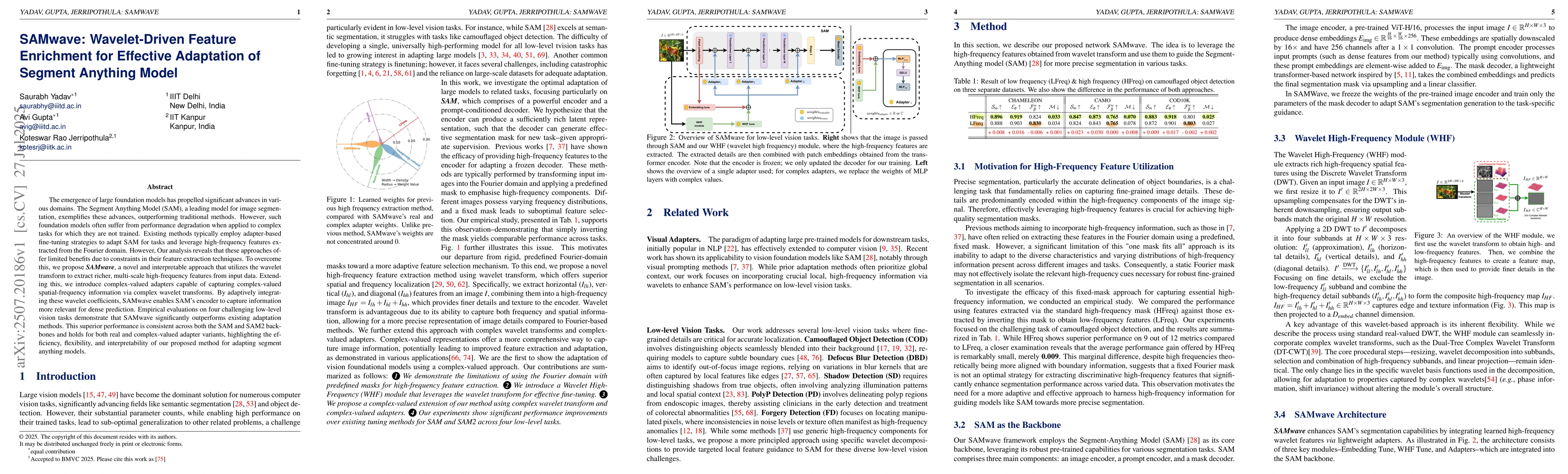 The emergence of large foundation models has propelled significant advances in various domains. The Segment Anything Model (SAM), a leading model for image segmentation, exemplifies these advances, outperforming traditional methods. However, such foundation models often suffer from performance degradation when applied to complex tasks for which they are not trained. Existing methods typically employ adapter-based fine-tuning strategies to adapt SAM for tasks and leverage high-frequency features extracted from the Fourier domain. However, Our analysis reveals that these approaches offer limited benefits due to constraints in their feature extraction techniques. To overcome this, we propose \textbf{\textit{SAMwave}}, a novel and interpretable approach that utilizes the wavelet transform to extract richer, multi-scale high-frequency features from input data. Extending this, we introduce complex-valued adapters capable of capturing complex-valued spatial-frequency information via complex wavelet transforms. By adaptively integrating these wavelet coefficients, SAMwave enables SAM's encoder to capture information more relevant for dense prediction. Empirical evaluations on four challenging low-level vision tasks demonstrate that SAMwave significantly outperforms existing adaptation methods. This superior performance is consistent across both the SAM and SAM2 backbones and holds for both real and complex-valued adapter variants, highlighting the efficiency, flexibility, and interpretability of our proposed method for adapting segment anything models.