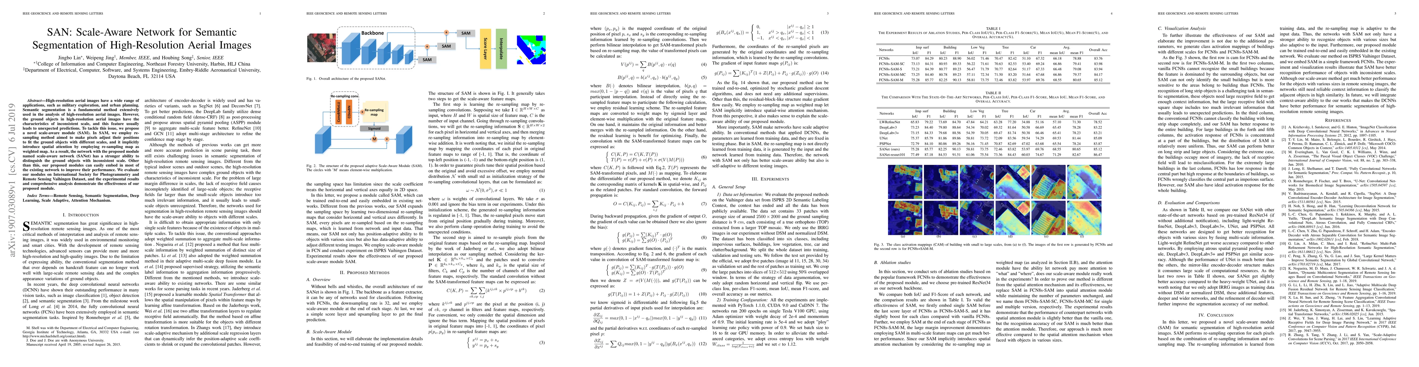 The paper proposes a Scale-Aware Network (SANet) for semantic segmentation of high-resolution aerial images, introducing a Scale-Aware Module (SAM) that uses re-sampling to adjust pixel positions and spatial attention, thereby improving the network's ability to handle objects of inconsistent scales. Experimental results on the Vaihingen Dataset show the effectiveness of the proposed module.