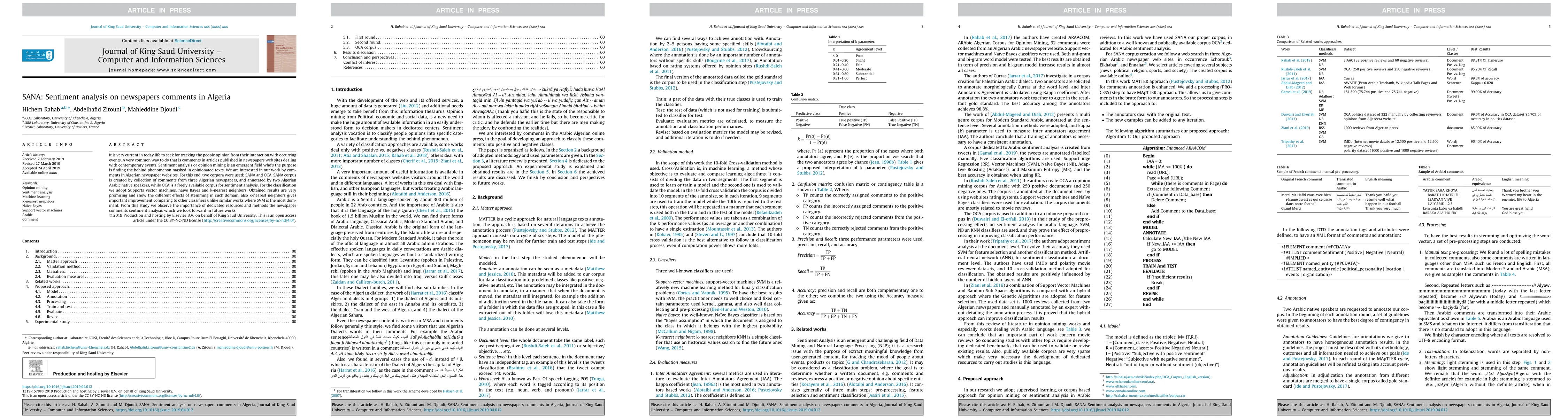 This paper explores sentiment analysis on comments from Algerian newspaper websites using the SANA corpus, which includes comments from three Algerian newspapers annotated by native speakers. The study compares the performance of SVM, naive Bayes, and k-nearest neighbors classifiers, finding that k-nearest neighbors provides significant improvements, highlighting the importance of tailored resources and methods for newspaper comment analysis.
