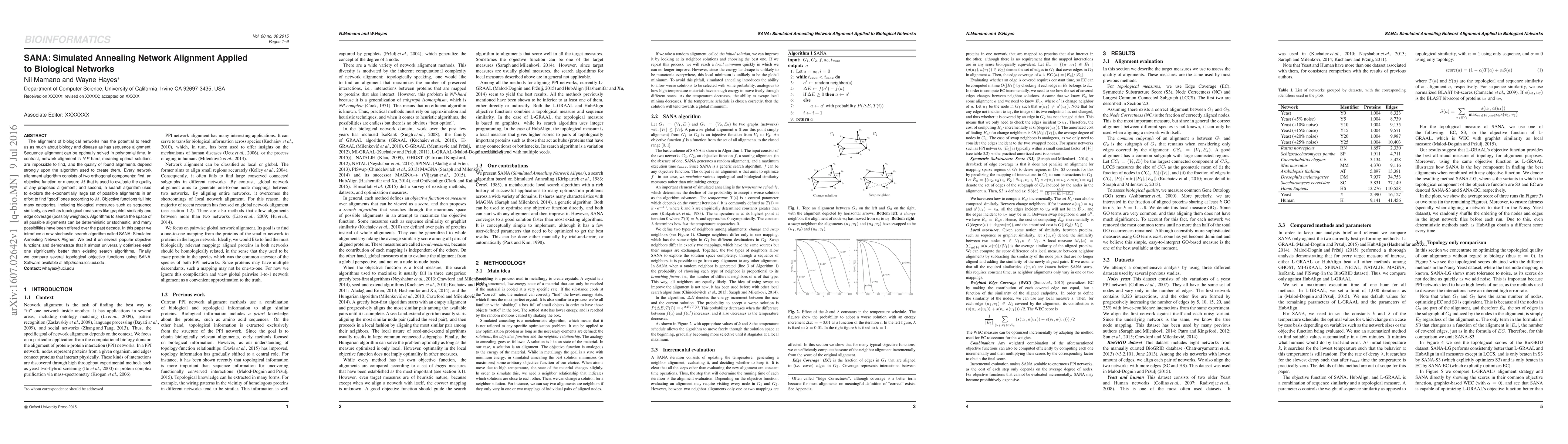 This paper introduces SANA, a Simulated Annealing Network Aligner, for aligning biological networks, which is shown to outperform existing search algorithms across various objective functions. The study highlights SANA's effectiveness in optimizing network alignments, offering a significant improvement over current methods.