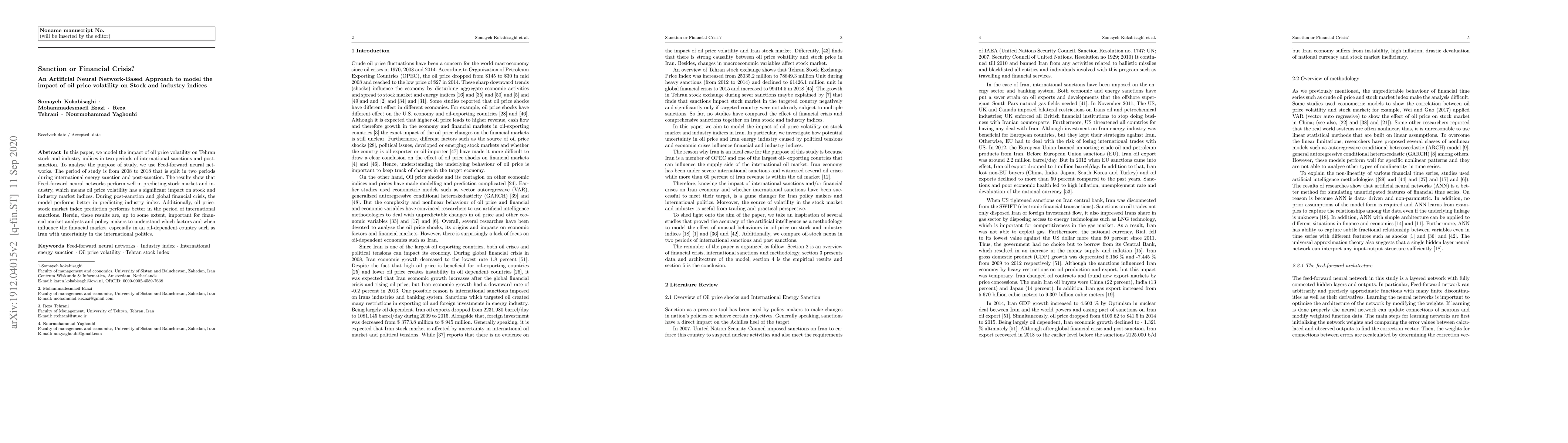 In this paper, we model the impact of oil price volatility on Tehranstock and industry indices in two periods of international sanctions and post-sanction. To analyse the purpose of study, we use Feed-forward neural net-works. The period of study is from 2008 to 2018 that is split in two periods during international energy sanction and post-sanction. The results show that Feed-forward neural networks perform well in predicting stock market and industry, which means oil price volatility has a significant impact on stock and industry market indices. During post-sanction and global financial crisis, the model performs better in predicting industry index. Additionally, oil price-stock market index prediction performs better in the period of international sanctions. Herein, these results are, up to some extent, important for financial market analysts and policy makers to understand which factors and when influence the financial market, especially in an oil-dependent country such asIran with uncertainty in the international politics. Keywords: Feed-forward neural networks,Industry index,International energy sanction,Oil price volatility,Tehran stock index