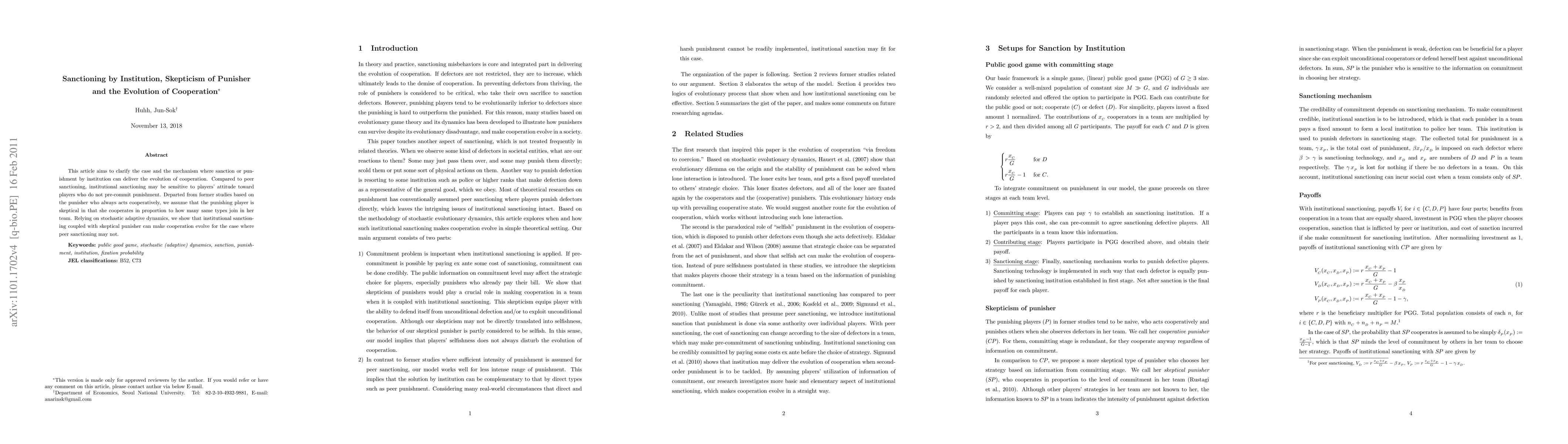 This paper explores how institutional sanctioning, compared to peer sanctioning, can lead to the evolution of cooperation, especially when the punisher is skeptical and cooperates conditionally based on team composition. Using stochastic adaptive dynamics, it demonstrates that institutional sanctioning can foster cooperation even when peer sanctioning fails.