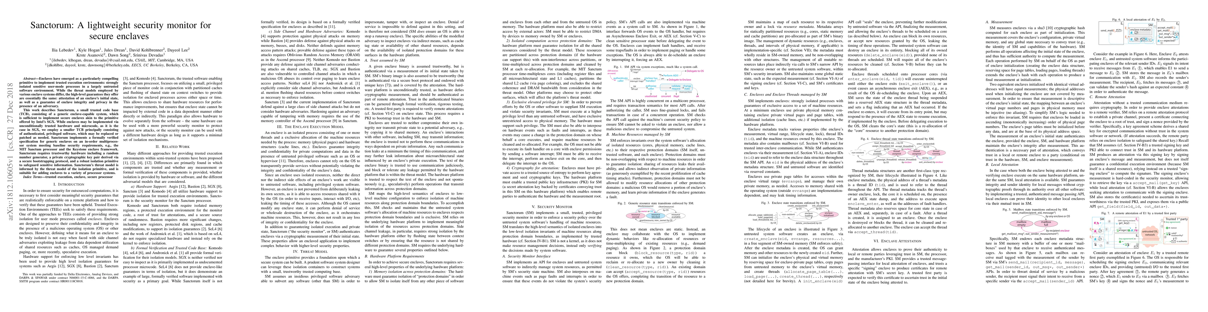 Sanctorum is a lightweight security monitor for implementing secure enclaves using a small trusted code base, primarily composed of authenticated, privileged software. It provides formal verification and meets baseline security requirements, suitable for various processor systems.