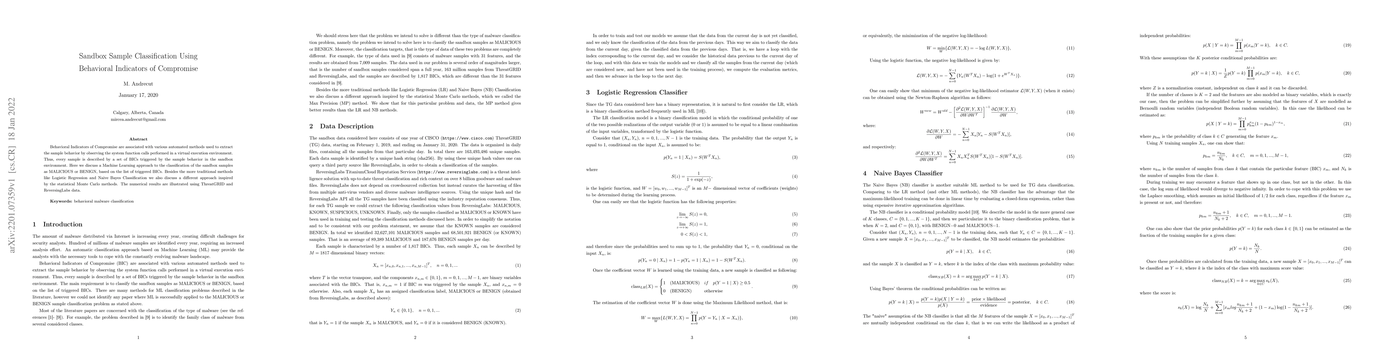 Behavioral Indicators of Compromise are associated with various automated methods used to extract the sample behavior by observing the system function calls performed in a virtual execution environment. Thus, every sample is described by a set of BICs triggered by the sample behavior in the sandbox environment. Here we discuss a Machine Learning approach to the classification of the sandbox samples as MALICIOUS or BENIGN, based on the list of triggered BICs. Besides the more traditional methods like Logistic Regression and Naive Bayes Classification we also discuss a different approach inspired by the statistical Monte Carlo methods. The numerical results are illustrated using ThreatGRID and ReversingLabs data.