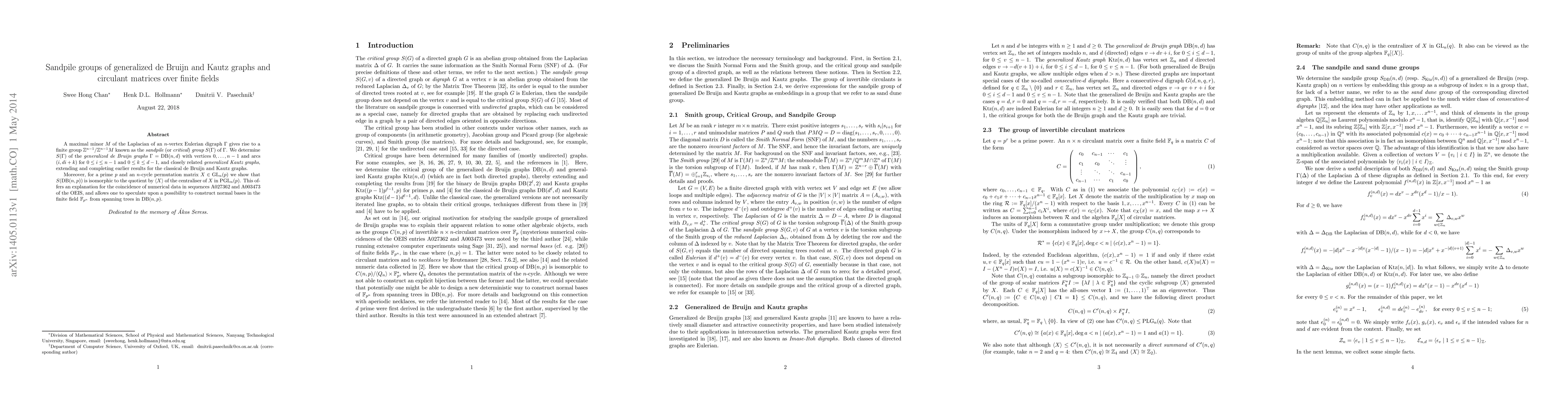 This paper determines the sandpile group $S(\Gamma)$ of generalized de Bruijn and Kautz graphs, revealing its isomorphism to a quotient of the centralizer of a circulant matrix in projective general linear group over a finite field. This finding connects numerical data in OEIS sequences and suggests a method for constructing normal bases in finite fields.