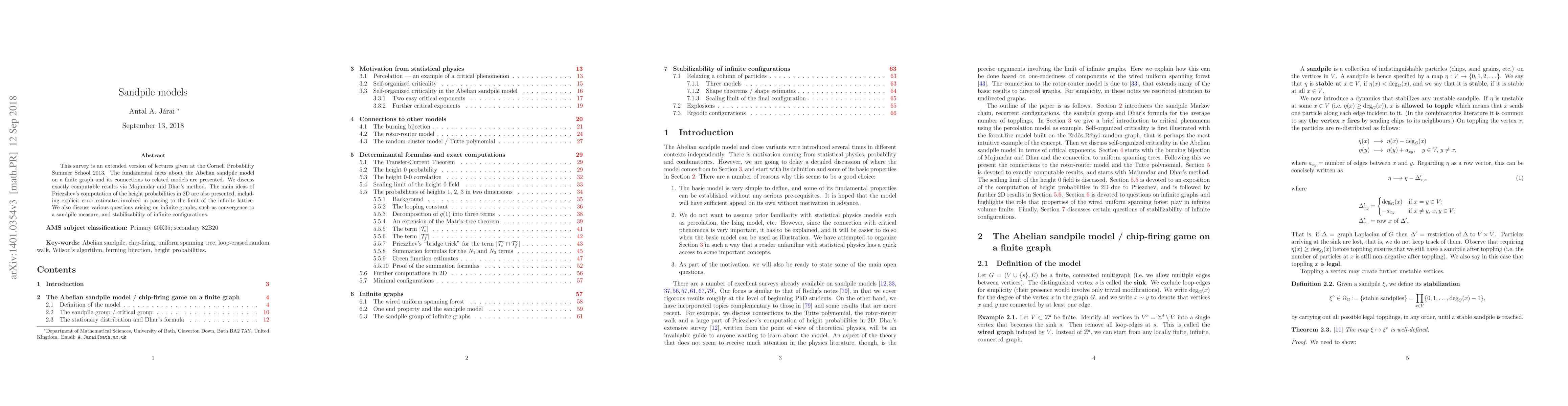 This paper surveys the Abelian sandpile model on finite graphs, highlighting exactly computable results through Majumdar and Dhar's method and Priezzhev's computation of height probabilities in 2D, along with error estimates. It also explores issues on infinite graphs, including convergence to a sandpile measure and stabilizability.