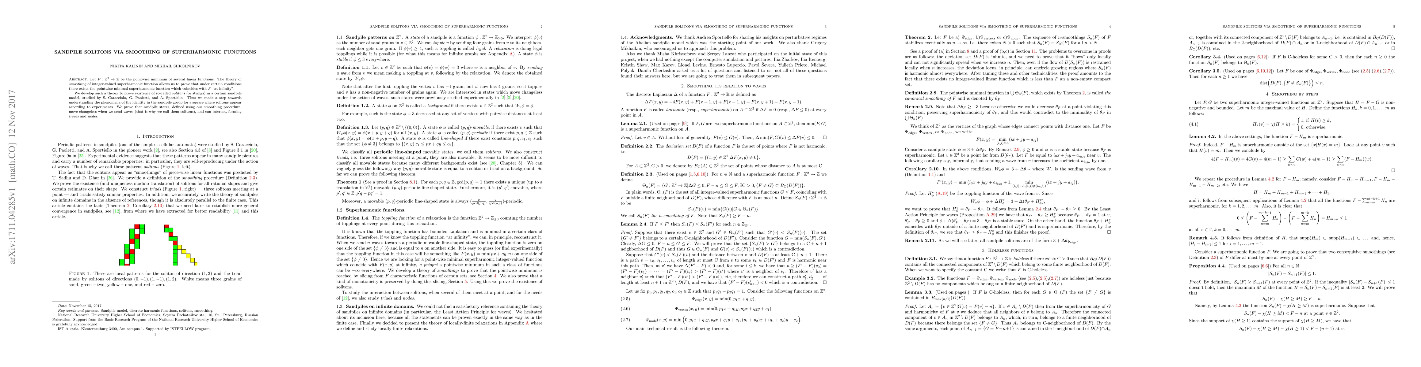 Let $F:\mathbb Z^2\to \mathbb Z$ be the pointwise minimum of several linear functions. The theory of smoothing of integer-valued superharmonic function allows us to prove that under certain conditions there exists the pointwise minimal superharmonic function which coincides with $F$ "at infinity". We develop such a theory to prove the existence of so-called solitons (or strings) in a certain sandpile model, studied by S. Caracciolo, G. Paoletti, and A. Sportiello. Thus we made a step towards understanding the phenomena of the identity in the sandpile group for a square where solitons appear according to experiments. We prove that sandpile states, defined using our smoothing procedure, move changeless when we send waves (that is why we call them solitons), and can interact, forming triads and nodes.