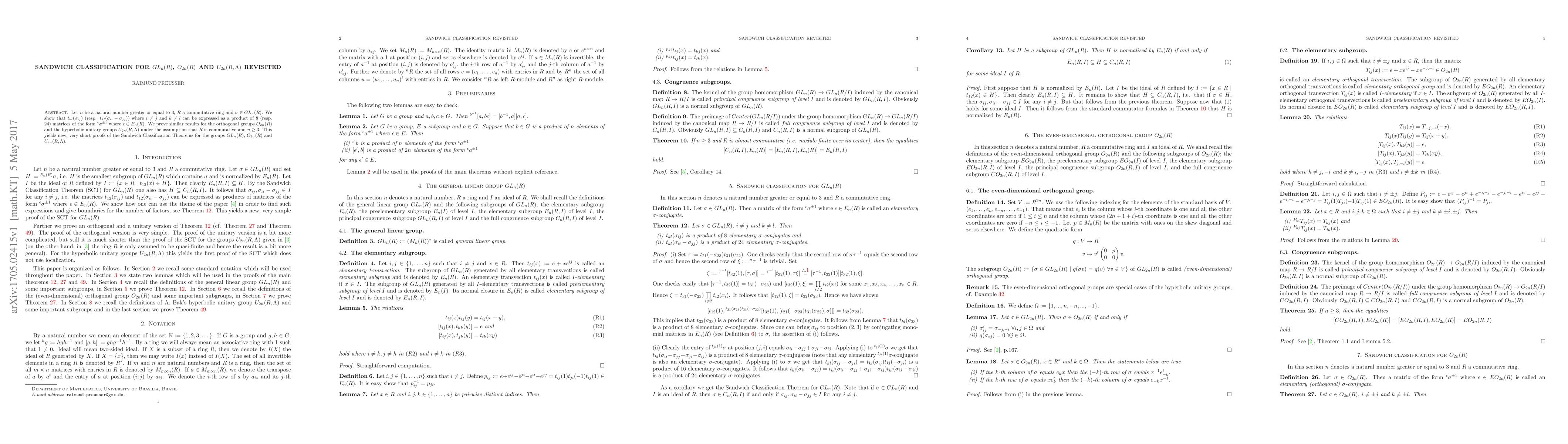 This research paper provides new proofs for Sandwich Classification Theorems in groups $GL_n(R)$, $O_{2n}(R)$, and $U_{2n}(R, ext{«})$, showing that certain matrix expressions can be simplified using products of specific matrices from the group's center.
