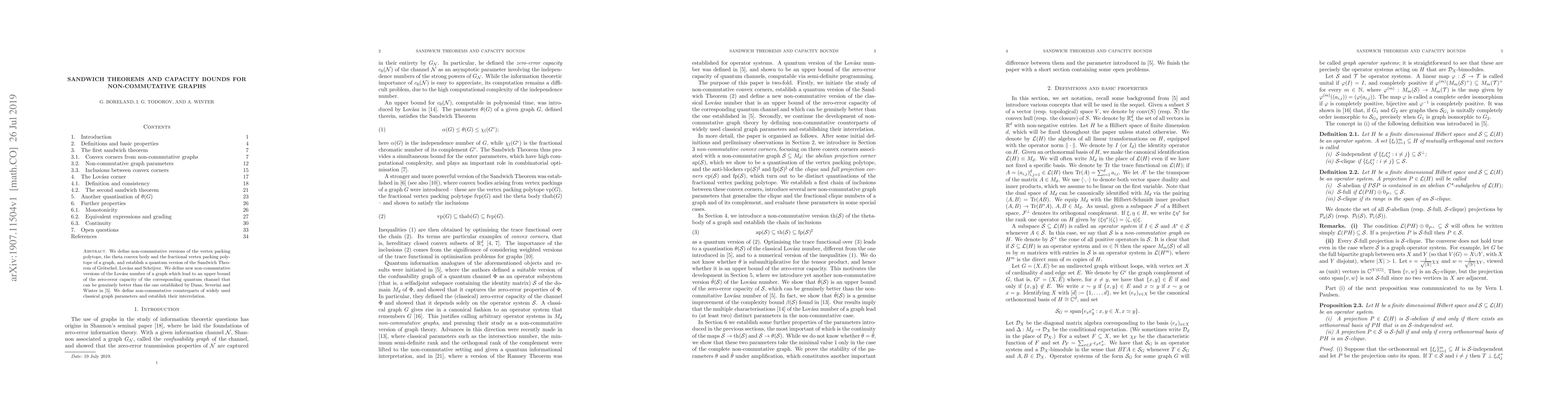 We define non-commutative versions of the vertex packing polytope, the theta convex body and the fractional vertex packing polytope of a graph, and establish a quantum version of the Sandwich Theorem of Gr\"{o}tschel, Lov\'{a}sz and Schrijver. We define new non-commutative versions of the Lov\'{a}sz number of a graph which lead to an upper bound of the zero-error capacity of the corresponding quantum channel that can be genuinely better than the one established previously by Duan, Severini and Winter. We define non-commutative counterparts of widely used classical graph parameters and establish their interrelation.