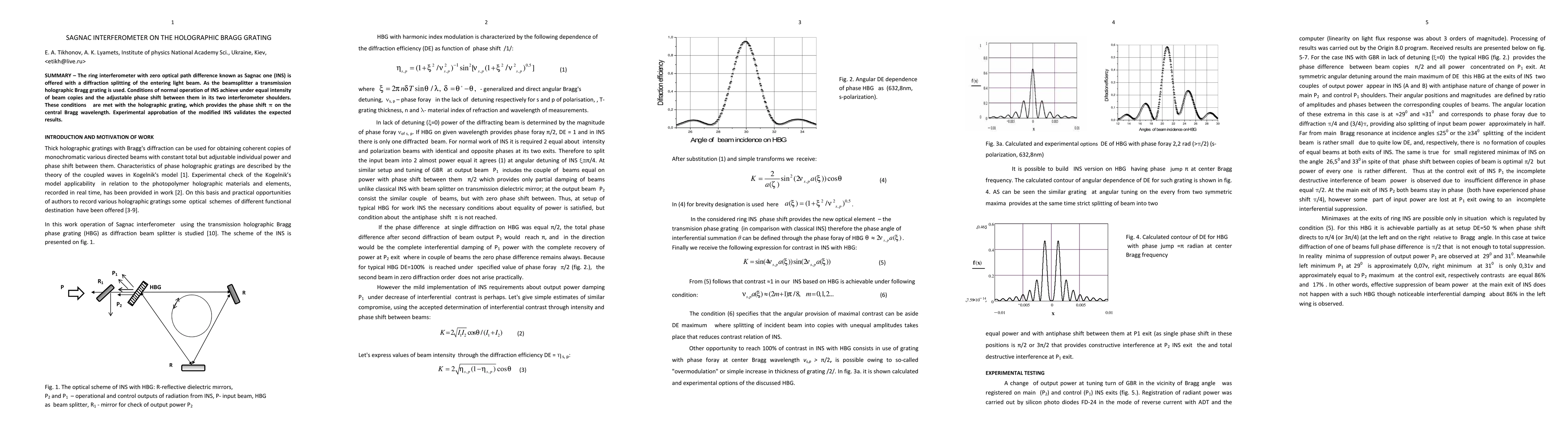The paper presents a Sagnac interferometer using a holographic Bragg grating as a beamsplitter, achieving normal operation through equal beam intensity and adjustable phase shift, validated by experimental results. The holographic grating provides a 180° phase shift at the central Bragg wavelength, confirming the expected outcomes.