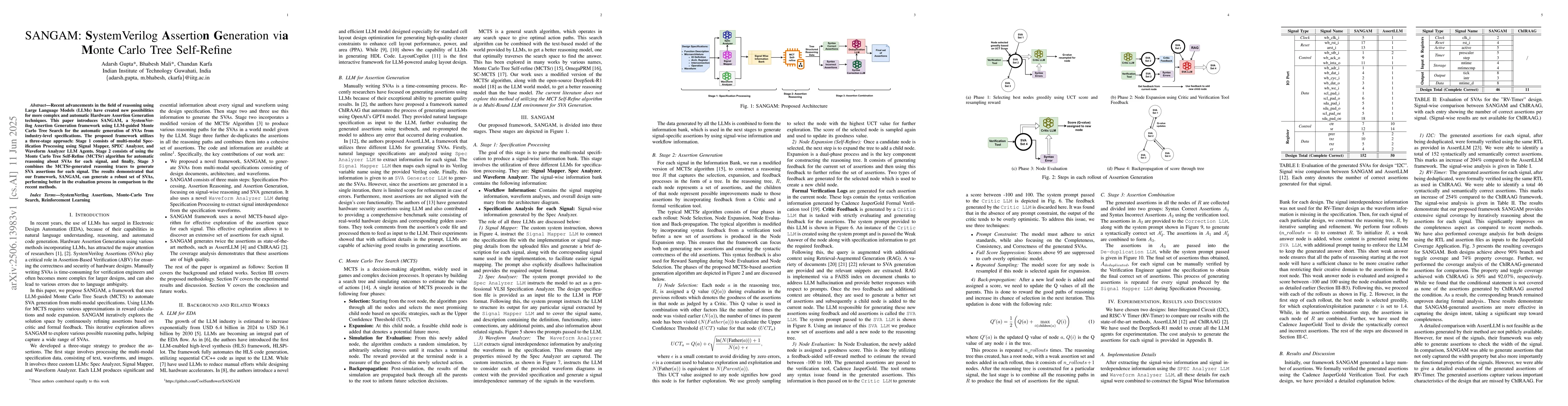 The paper introduces SANGAM, a SystemVerilog Assertion Generation framework using LLM-guided Monte Carlo Tree Search. It follows a three-stage approach: Specification Processing, Assertion Reasoning, and Assertion Combination.