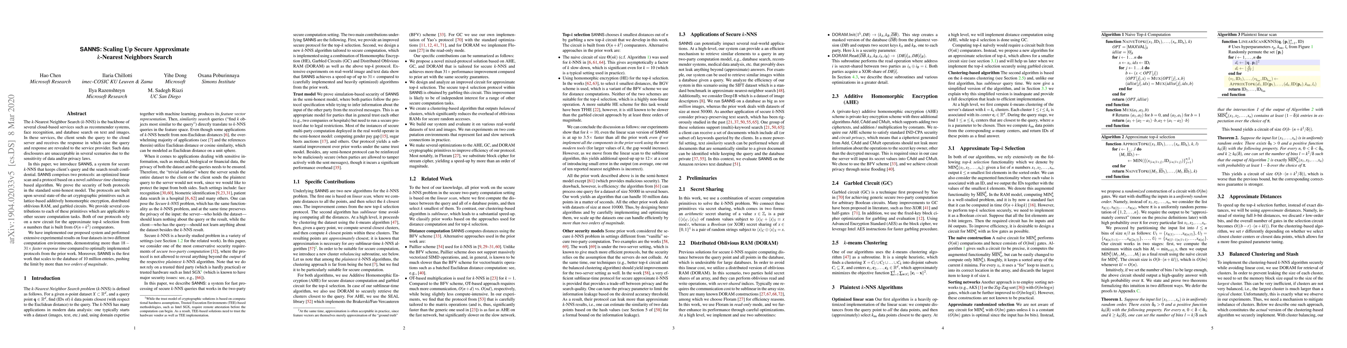 The $k$-Nearest Neighbor Search ($k$-NNS) is the backbone of several cloud-based services such as recommender systems, face recognition, and database search on text and images. In these services, the client sends the query to the cloud server and receives the response in which case the query and response are revealed to the service provider. Such data disclosures are unacceptable in several scenarios due to the sensitivity of data and/or privacy laws. In this paper, we introduce SANNS, a system for secure $k$-NNS that keeps client's query and the search result confidential. SANNS comprises two protocols: an optimized linear scan and a protocol based on a novel sublinear time clustering-based algorithm. We prove the security of both protocols in the standard semi-honest model. The protocols are built upon several state-of-the-art cryptographic primitives such as lattice-based additively homomorphic encryption, distributed oblivious RAM, and garbled circuits. We provide several contributions to each of these primitives which are applicable to other secure computation tasks. Both of our protocols rely on a new circuit for the approximate top-$k$ selection from $n$ numbers that is built from $O(n + k^2)$ comparators. We have implemented our proposed system and performed extensive experimental results on four datasets in two different computation environments, demonstrating more than $18-31\times$ faster response time compared to optimally implemented protocols from the prior work. Moreover, SANNS is the first work that scales to the database of 10 million entries, pushing the limit by more than two orders of magnitude.