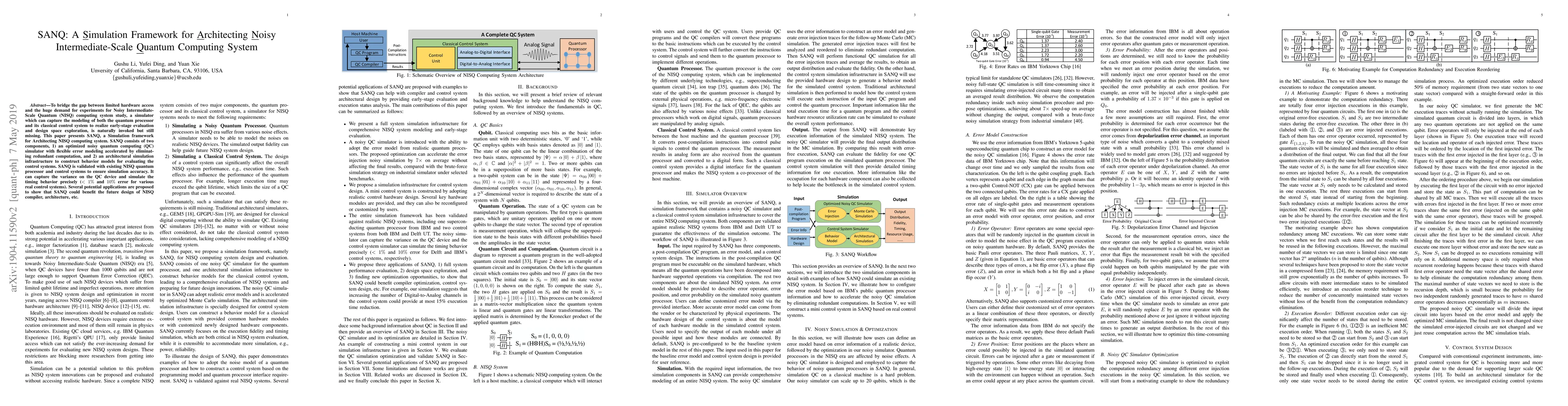 SANQ is a simulation framework for architecting Noisy Intermediate-Scale Quantum computing systems, featuring an optimized noisy quantum computing simulator and an architectural simulation infrastructure for evaluating control systems. It accurately models quantum processor variance and control system timing behavior, aiding in NISQ system design and compiler development.