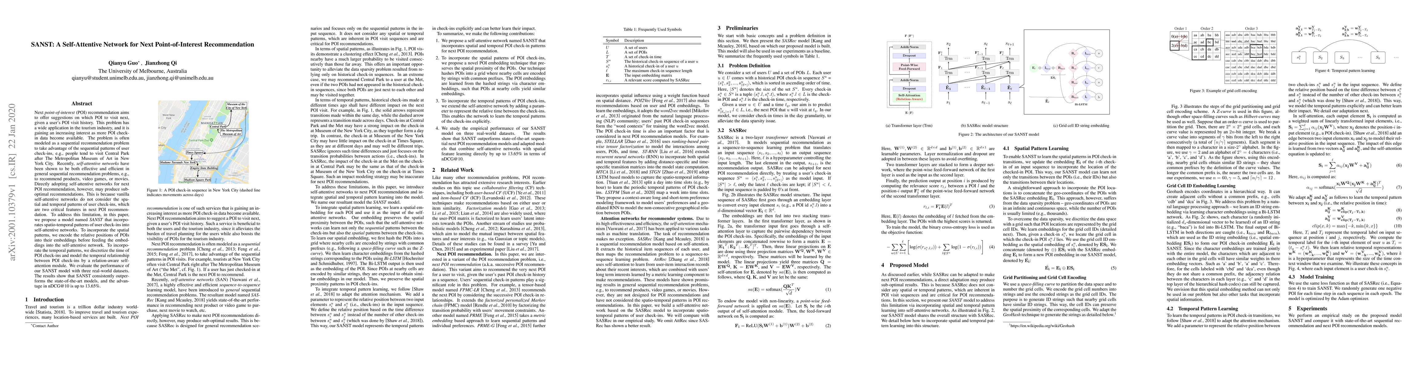 The paper proposes SANST, a self-attentive network that incorporates spatio-temporal patterns into next point-of-interest recommendation, outperforming state-of-the-art models by up to 13.65% in nDCG@10 on real-world datasets.