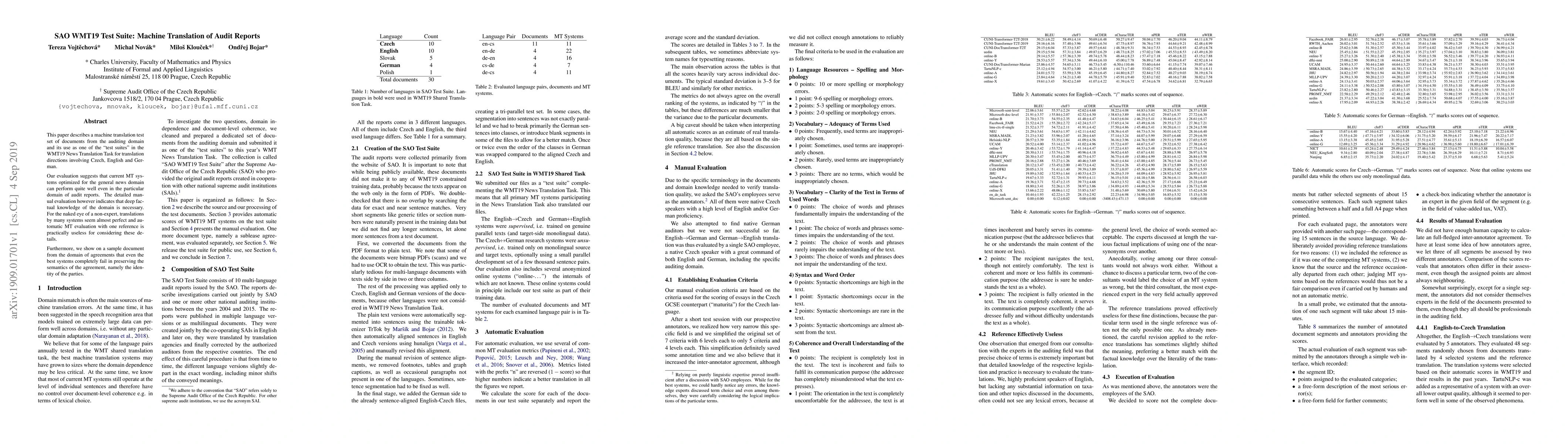 This paper introduces a machine translation test suite for audit reports used in the WMT19 News Translation Task, showing that general news domain MT systems perform well but lack deep domain-specific knowledge, especially in preserving semantics like the identity of parties in agreements.