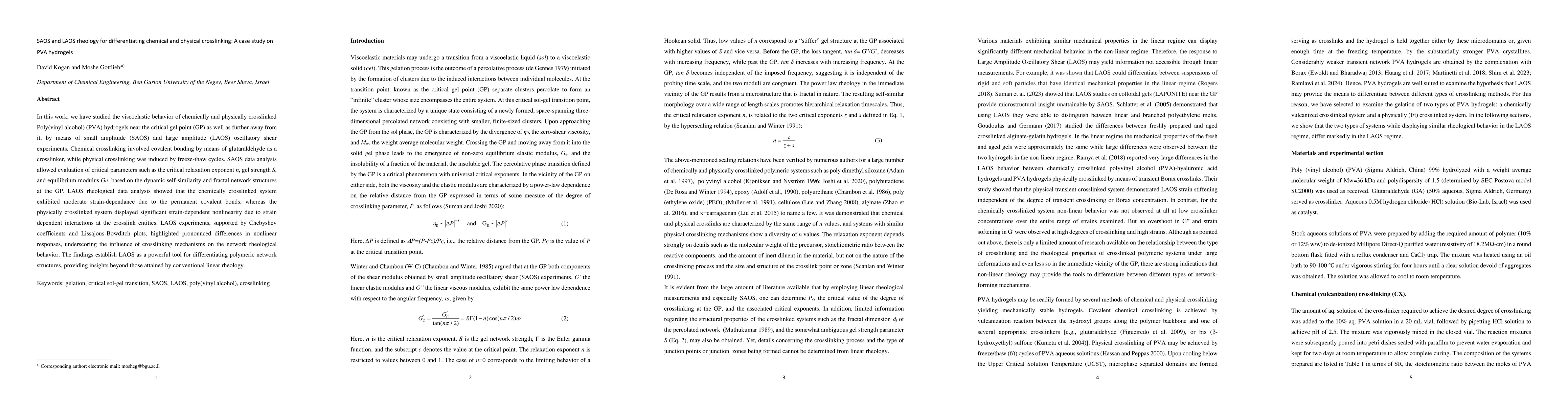 The study employed small amplitude oscillatory shear (SAOS) and large amplitude oscillatory shear (LAOS) rheological techniques to analyze the viscoelastic behavior of chemically and physically crosslinked poly(vinyl alcohol) (PVA) hydrogels. Fourier transformation and Chebyshev coefficients were used to extract nonlinear responses, while stress relaxation experiments and inverse quenching methods were applied to determine critical gelation parameters.