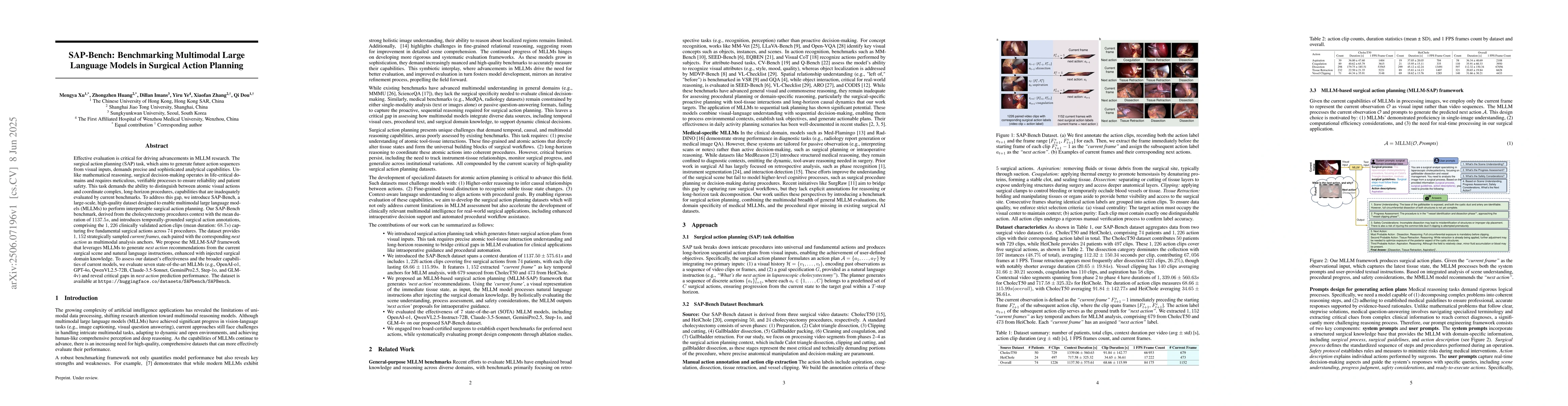 Effective evaluation is critical for driving advancements in MLLM research. The surgical action planning (SAP) task, which aims to generate future action sequences from visual inputs, demands precise and sophisticated analytical capabilities. Unlike mathematical reasoning, surgical decision-making operates in life-critical domains and requires meticulous, verifiable processes to ensure reliability and patient safety. This task demands the ability to distinguish between atomic visual actions and coordinate complex, long-horizon procedures, capabilities that are inadequately evaluated by current benchmarks. To address this gap, we introduce SAP-Bench, a large-scale, high-quality dataset designed to enable multimodal large language models (MLLMs) to perform interpretable surgical action planning. Our SAP-Bench benchmark, derived from the cholecystectomy procedures context with the mean duration of 1137.5s, and introduces temporally-grounded surgical action annotations, comprising the 1,226 clinically validated action clips (mean duration: 68.7s) capturing five fundamental surgical actions across 74 procedures. The dataset provides 1,152 strategically sampled current frames, each paired with the corresponding next action as multimodal analysis anchors. We propose the MLLM-SAP framework that leverages MLLMs to generate next action recommendations from the current surgical scene and natural language instructions, enhanced with injected surgical domain knowledge. To assess our dataset's effectiveness and the broader capabilities of current models, we evaluate seven state-of-the-art MLLMs (e.g., OpenAI-o1, GPT-4o, QwenVL2.5-72B, Claude-3.5-Sonnet, GeminiPro2.5, Step-1o, and GLM-4v) and reveal critical gaps in next action prediction performance.