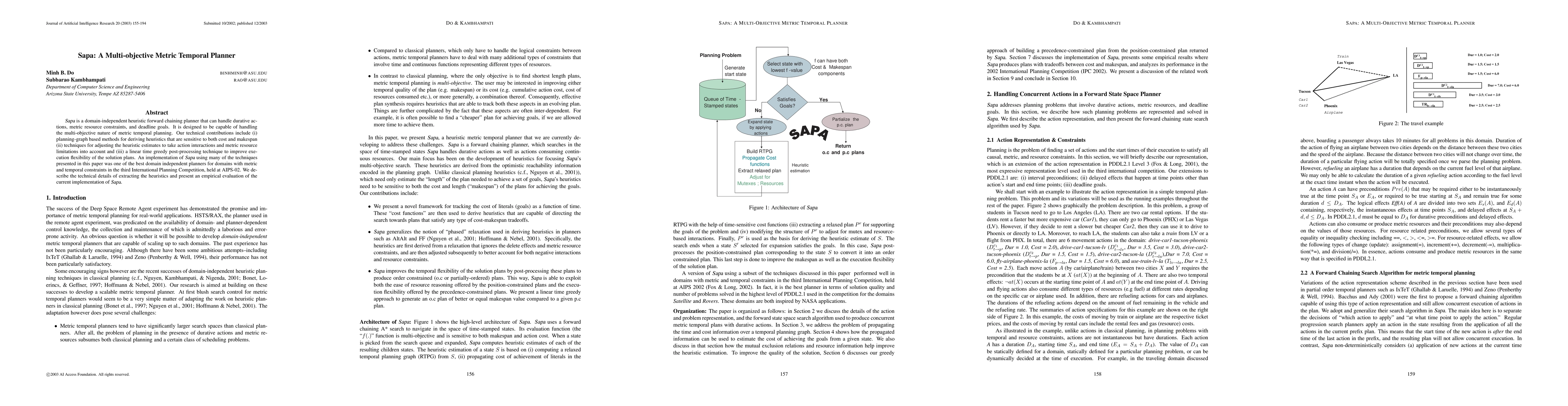 SAPA is a versatile, domain-independent planner that efficiently handles durative actions, metric resource constraints, and deadline goals through multi-objective planning. It employs planning-graph based heuristics, adjusts for action interactions, and uses a linear time post-processing technique to enhance plan flexibility.