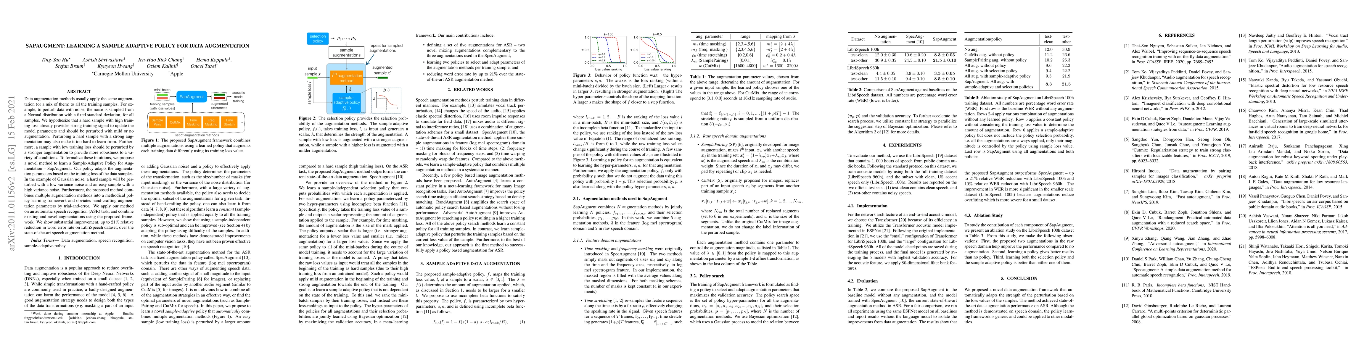 SapAugment proposes a Sample-Adaptive Policy for Data Augmentation that dynamically adjusts augmentation strength based on training loss, enhancing model robustness and performance. Applied to an automatic speech recognition task, it achieves a 21% relative reduction in word error rate compared to existing methods.