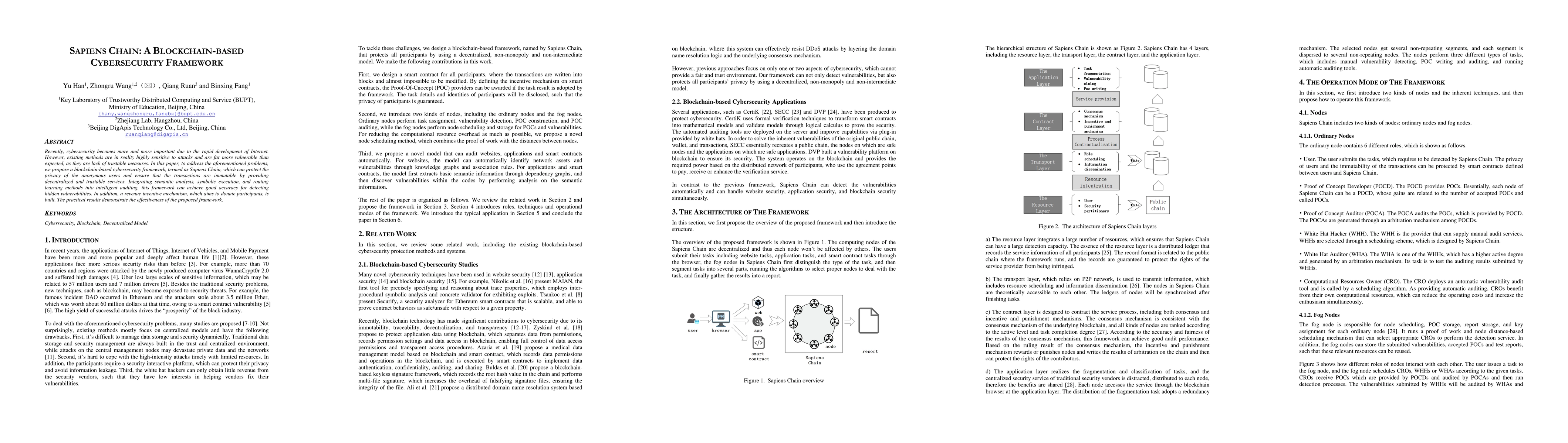 The paper proposes Sapiens Chain, a blockchain-based cybersecurity framework that enhances trust and privacy through decentralized services and intelligent auditing using semantic analysis, symbolic execution, and routing learning. The framework also includes a revenue incentive mechanism to engage participants, demonstrating its effectiveness in detecting hidden vulnerabilities.