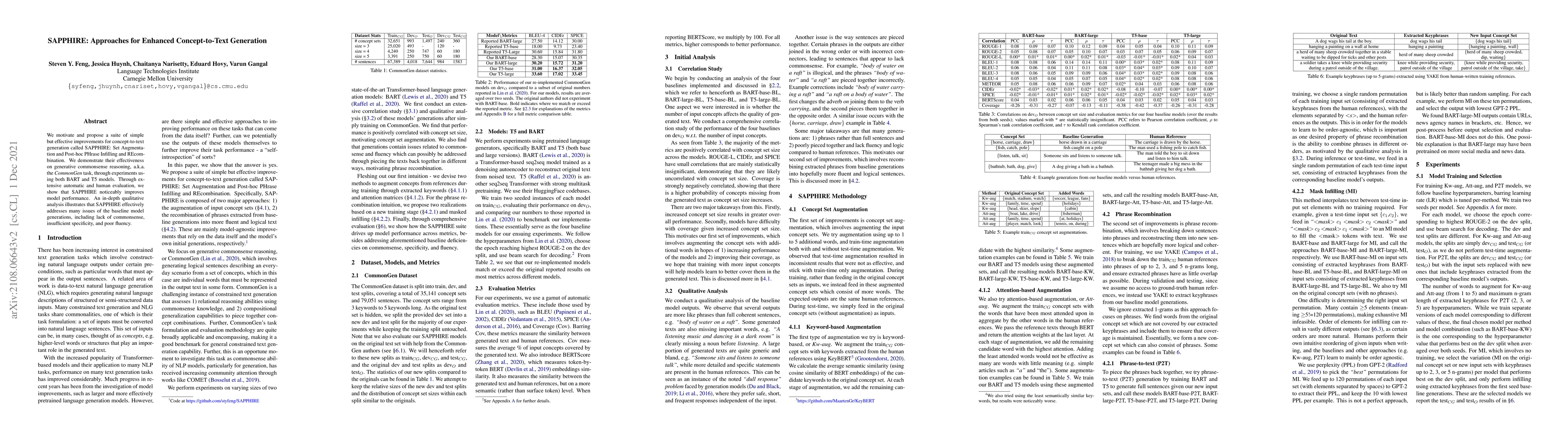 We motivate and propose a suite of simple but effective improvements for concept-to-text generation called SAPPHIRE: Set Augmentation and Post-hoc PHrase Infilling and REcombination. We demonstrate their effectiveness on generative commonsense reasoning, a.k.a. the CommonGen task, through experiments using both BART and T5 models. Through extensive automatic and human evaluation, we show that SAPPHIRE noticeably improves model performance. An in-depth qualitative analysis illustrates that SAPPHIRE effectively addresses many issues of the baseline model generations, including lack of commonsense, insufficient specificity, and poor fluency.