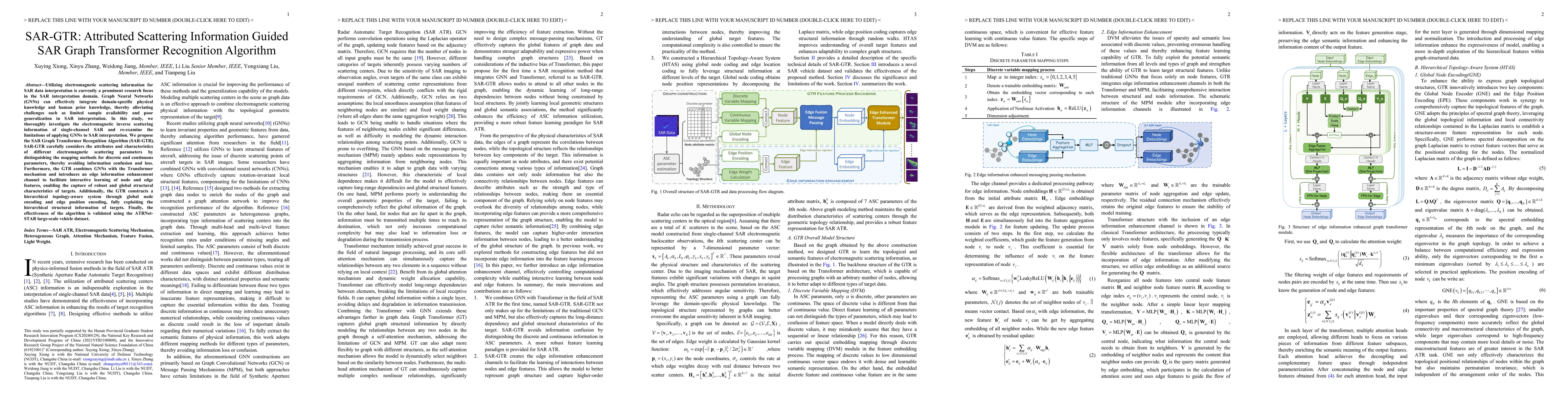 The research methodology involves investigating electromagnetic inverse scattering information of single-channel SAR data, re-examining GNN limitations in SAR interpretation, and proposing the SAR Graph Transformer Recognition Algorithm (SAR-GTR). SAR-GTR distinguishes mapping methods for discrete and continuous scattering parameters, integrates GNNs with the Transformer mechanism, and constructs a hierarchical topology-aware system.