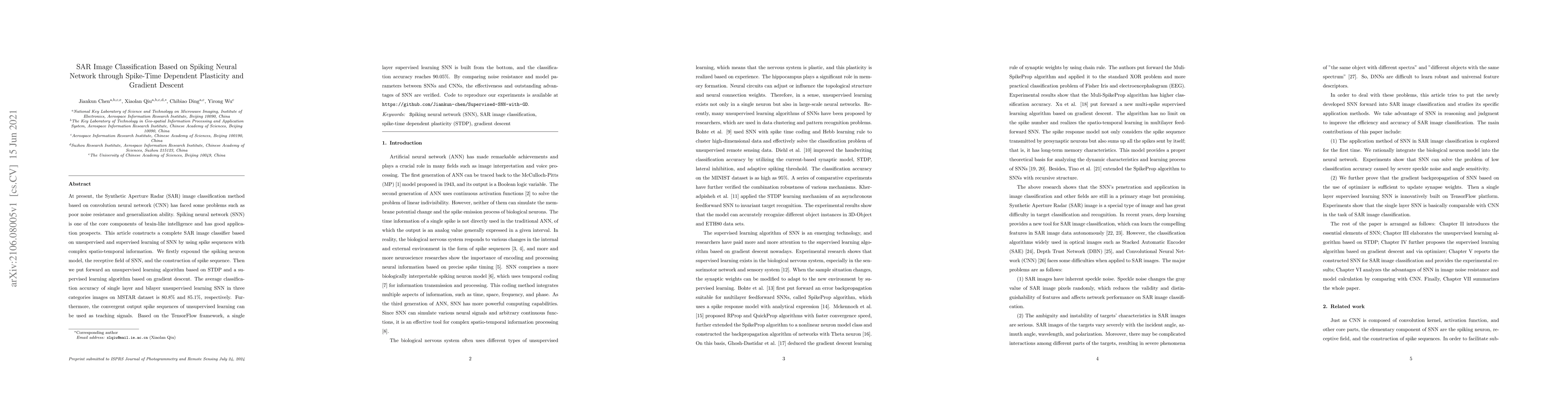 This paper proposes a SAR image classifier using a spiking neural network (SNN) with spike-time dependent plasticity and gradient descent for supervised learning. It demonstrates improved noise resistance and generalization compared to CNN-based methods, achieving 90.05% classification accuracy on the MSTAR dataset.