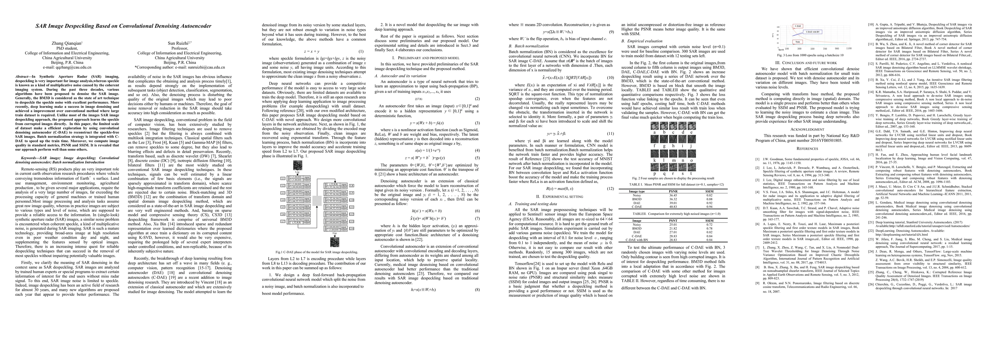 In Synthetic Aperture Radar (SAR) imaging, despeckling is very important for image analysis,whereas speckle is known as a kind of multiplicative noise caused by the coherent imaging system. During the past three decades, various algorithms have been proposed to denoise the SAR image. Generally, the BM3D is considered as the state of art technique to despeckle the speckle noise with excellent performance. More recently, deep learning make a success in image denoising and achieved a improvement over conventional method where large train dataset is required. Unlike most of the images SAR image despeckling approach, the proposed approach learns the speckle from corrupted images directly. In this paper, the limited scale of dataset make a efficient exploration by using convolutioal denoising autoencoder (C-DAE) to reconstruct the speckle-free SAR images. Batch normalization strategy is integrated with C- DAE to speed up the train time. Moreover, we compute image quality in standard metrics, PSNR and SSIM. It is revealed that our approach perform well than some others.