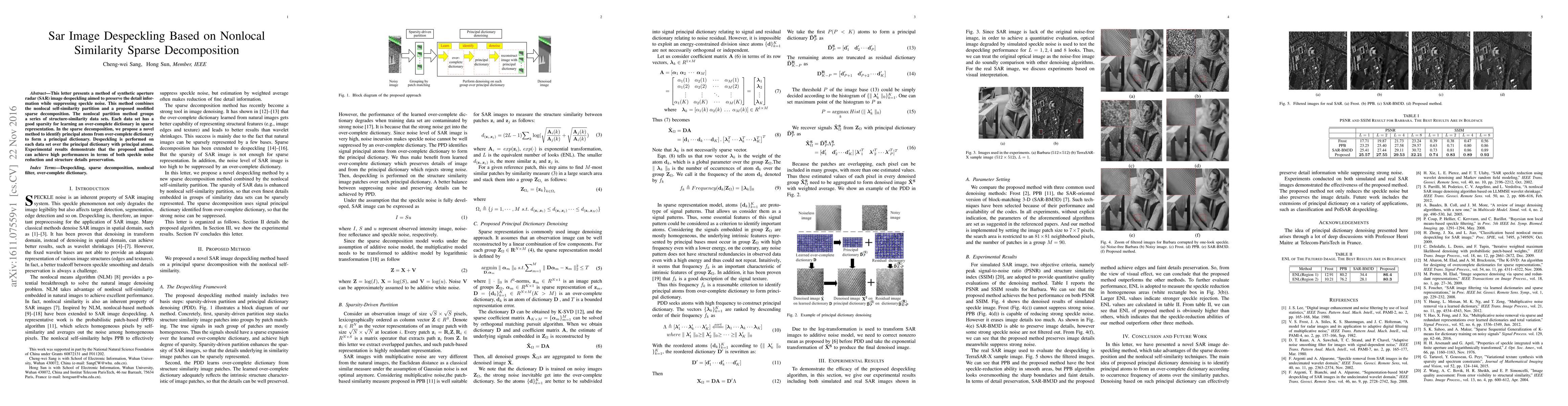 This paper proposes a novel SAR image despeckling method that combines nonlocal self-similarity partitioning with modified sparse decomposition to suppress speckle noise while preserving structural details. Experimental results show significant improvements in noise reduction and detail retention.