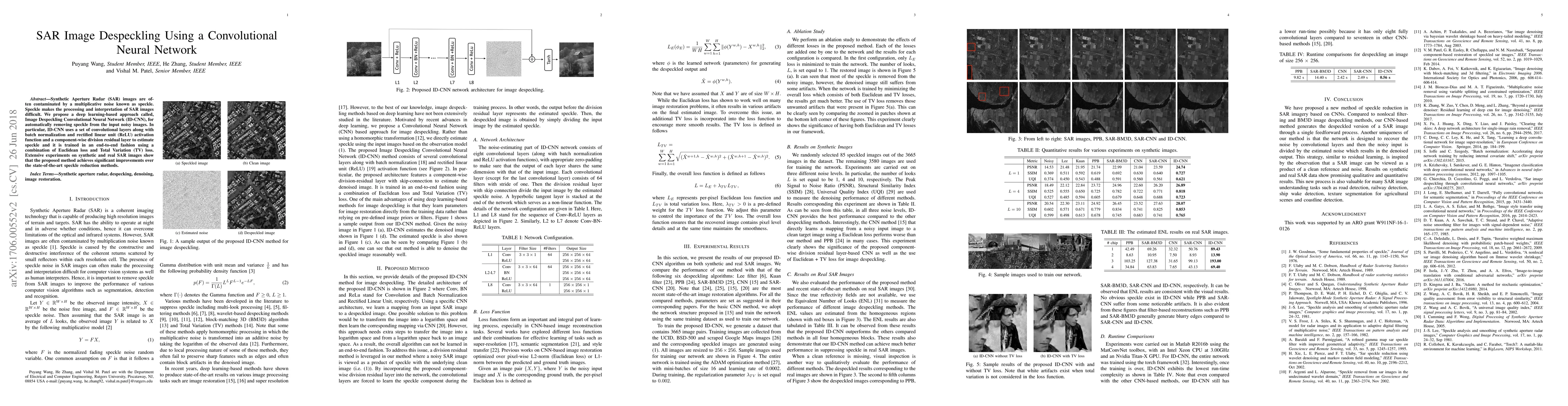 This paper proposes a deep learning-based method called Image Despeckling Convolutional Neural Network (ID-CNN) for removing speckle noise from Synthetic Aperture Radar (SAR) images. The method uses convolutional layers, batch normalization, and a residual layer, and is trained with Euclidean and Total Variation losses, achieving superior performance compared to existing techniques.