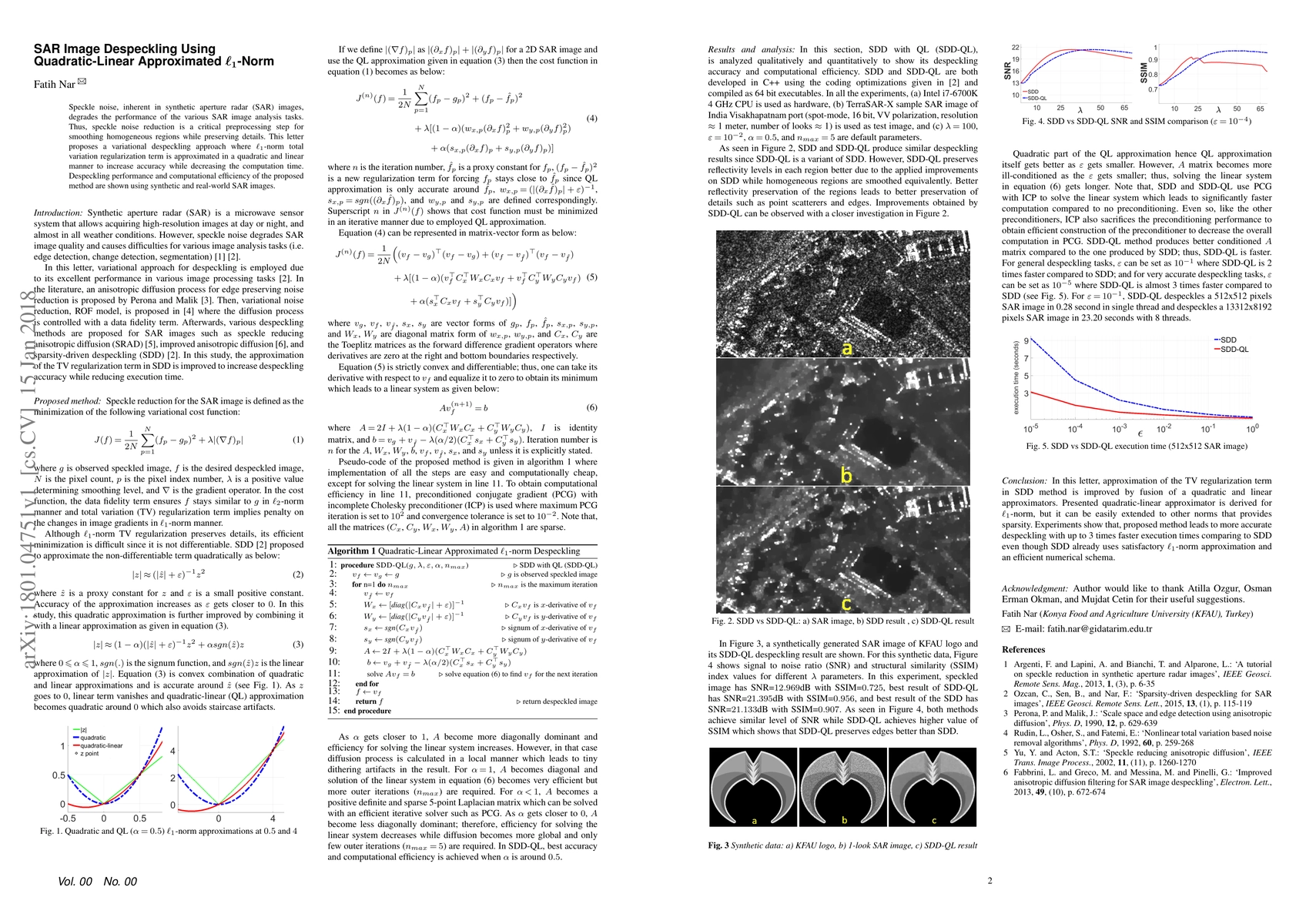 This paper proposes a variational method for SAR image despeckling using a quadratic-linear approximation of the L1-norm to enhance accuracy and reduce computation time, demonstrating its effectiveness on both synthetic and real SAR images. The method balances the trade-off between noise reduction and detail preservation.