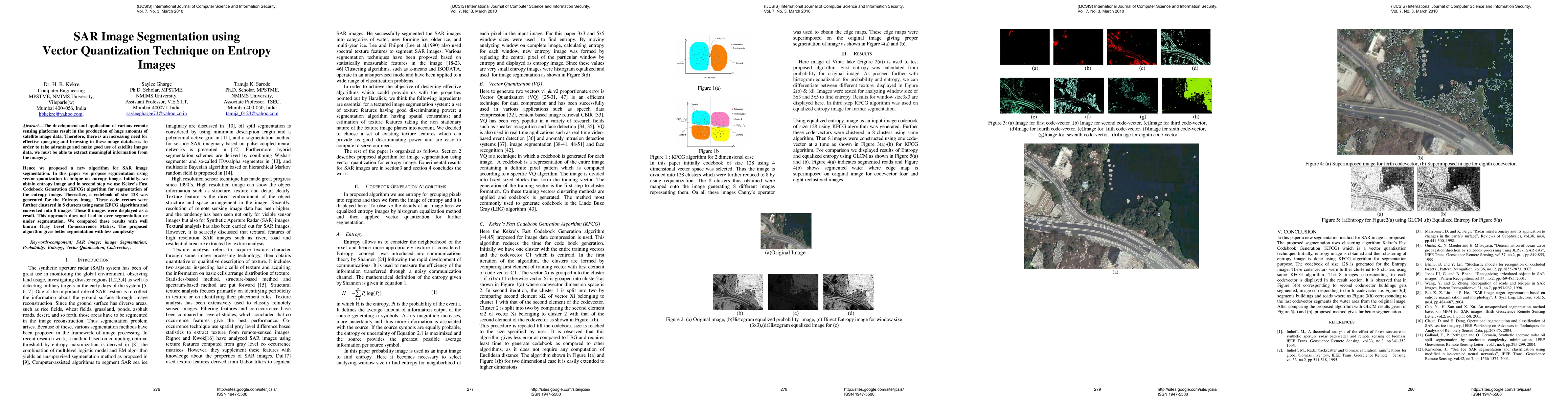 The development and application of various remote sensing platforms result in the production of huge amounts of satellite image data. Therefore, there is an increasing need for effective querying and browsing in these image databases. In order to take advantage and make good use of satellite images data, we must be able to extract meaningful information from the imagery. Hence we proposed a new algorithm for SAR image segmentation. In this paper we propose segmentation using vector quantization technique on entropy image. Initially, we obtain entropy image and in second step we use Kekre's Fast Codebook Generation (KFCG) algorithm for segmentation of the entropy image. Thereafter, a codebook of size 128 was generated for the Entropy image. These code vectors were further clustered in 8 clusters using same KFCG algorithm and converted into 8 images. These 8 images were displayed as a result. This approach does not lead to over segmentation or under segmentation. We compared these results with well known Gray Level Co-occurrence Matrix. The proposed algorithm gives better segmentation with less complexity.