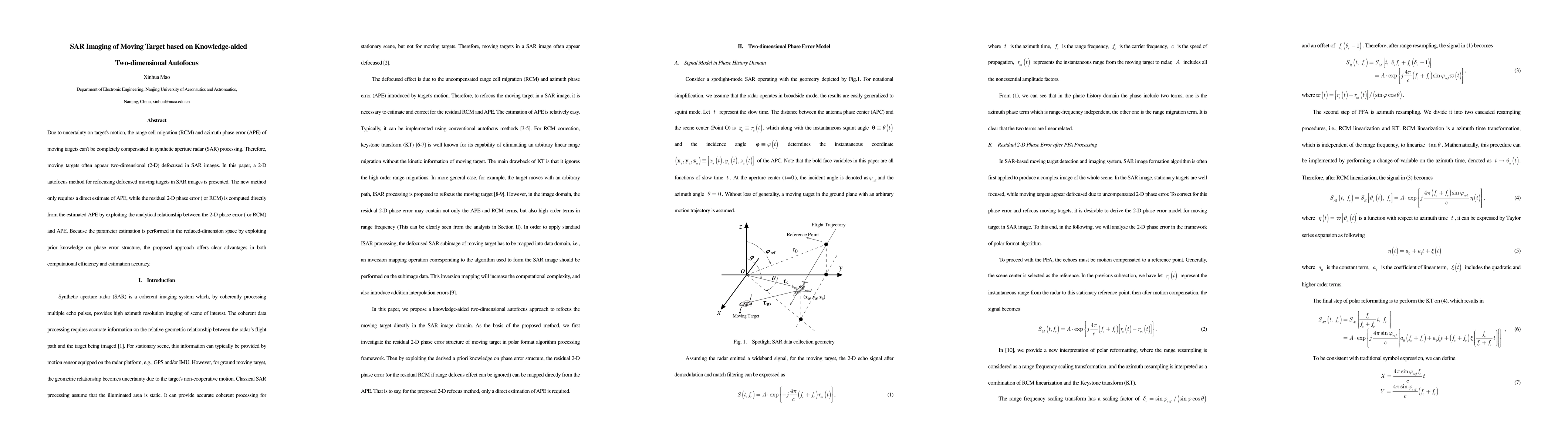 This paper presents a 2-D autofocus method for refocusing defocused moving targets in SAR images by estimating azimuth phase error and computing residual phase error analytically. The knowledge-aided approach enhances computational efficiency and estimation accuracy.