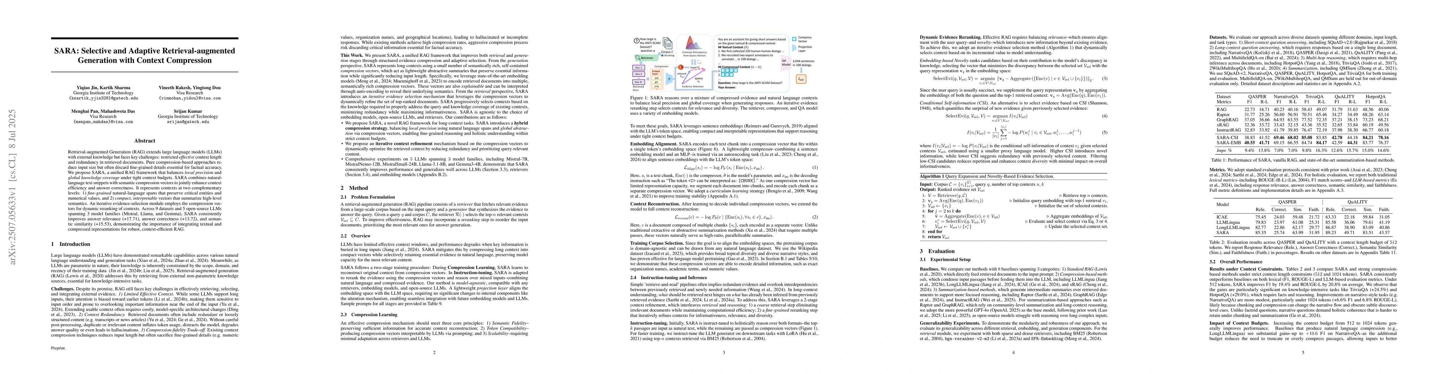 SARA introduces a novel unified RAG framework that combines natural-language text snippets with semantic compression vectors for efficient context representation and evidence selection.