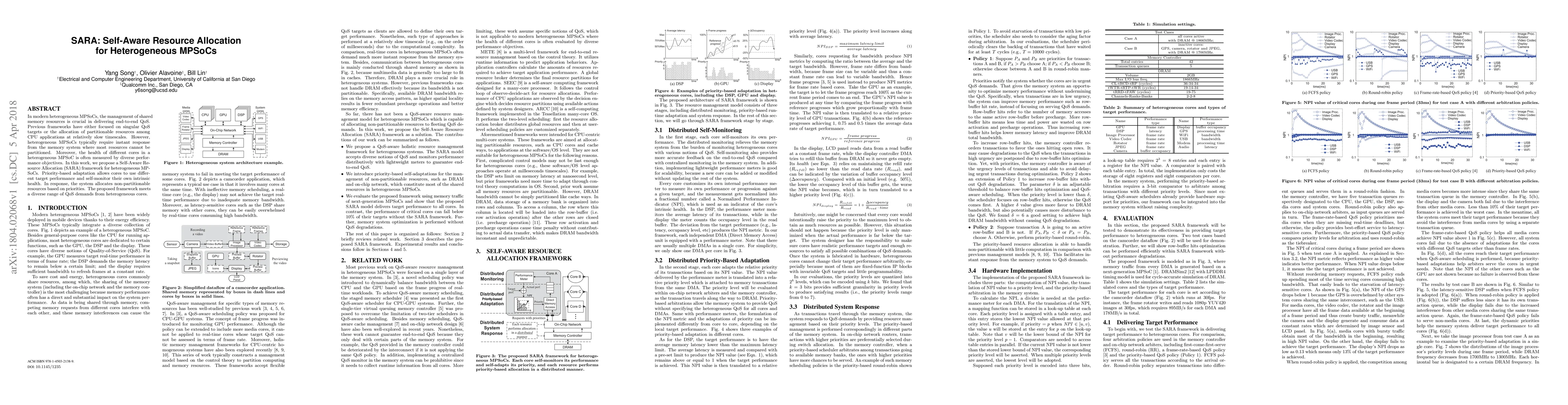 The SARA framework proposes a self-aware resource allocation method for heterogeneous MPSoCs, enabling cores to prioritize performance targets and self-monitor health, thereby dynamically allocating non-partitionable memory resources to meet diverse QoS demands. This approach addresses the need for instant memory responses in heterogeneous systems.
