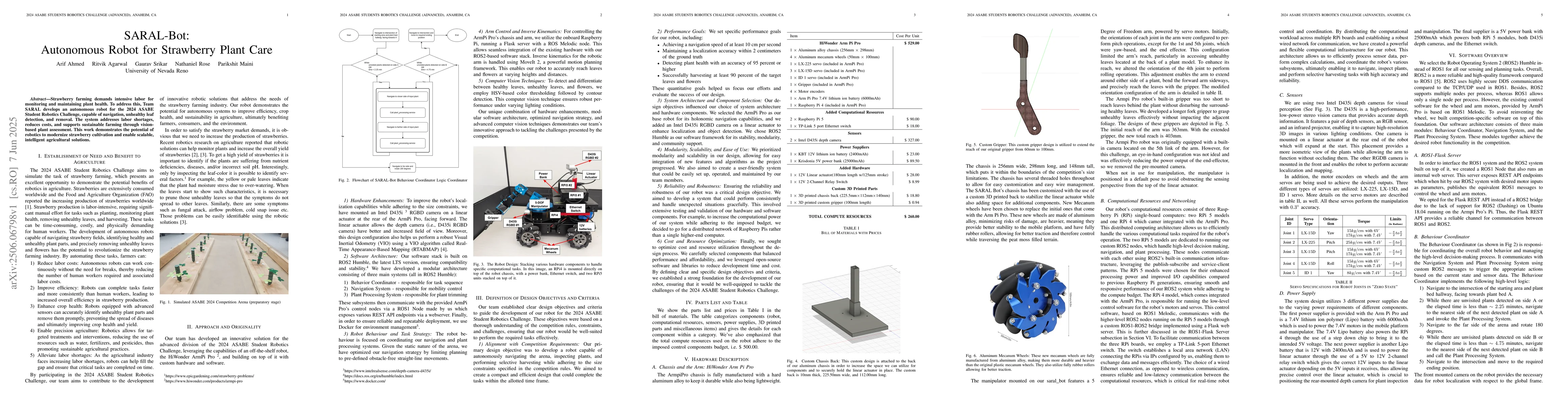 Strawberry farming demands intensive labor for monitoring and maintaining plant health. To address this, Team SARAL develops an autonomous robot for the 2024 ASABE Student Robotics Challenge, capable of navigation, unhealthy leaf detection, and removal. The system addresses labor shortages, reduces costs, and supports sustainable farming through vision-based plant assessment. This work demonstrates the potential of robotics to modernize strawberry cultivation and enable scalable, intelligent agricultural solutions.