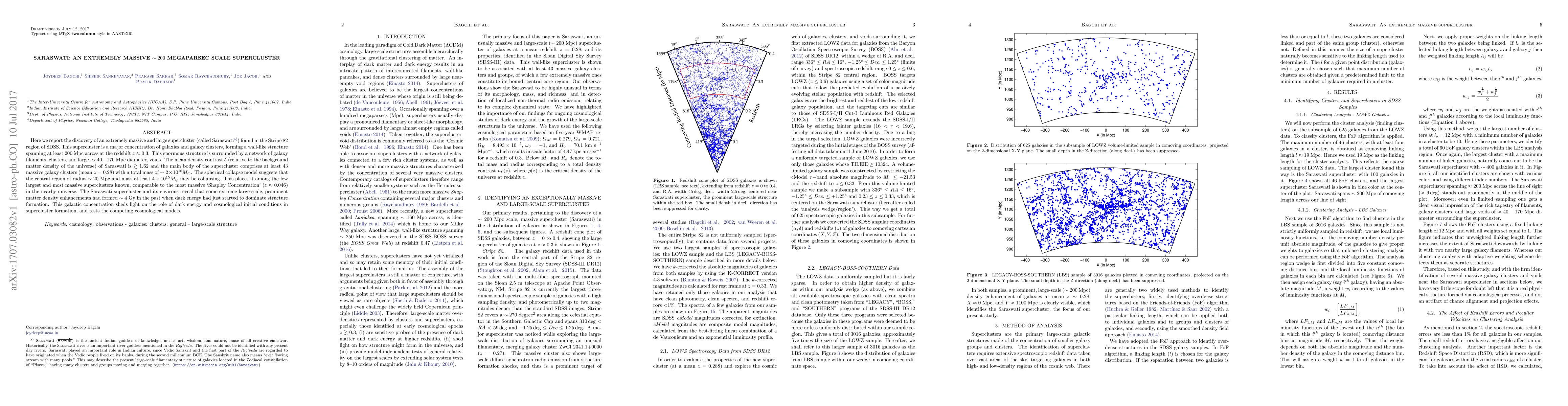 The Saraswati supercluster, discovered in the Stripe 82 region, spans 200 Mpc and comprises at least 43 massive galaxy clusters, making it one of the largest and most massive known. It provides insights into the role of dark energy and cosmological conditions in supercluster formation.