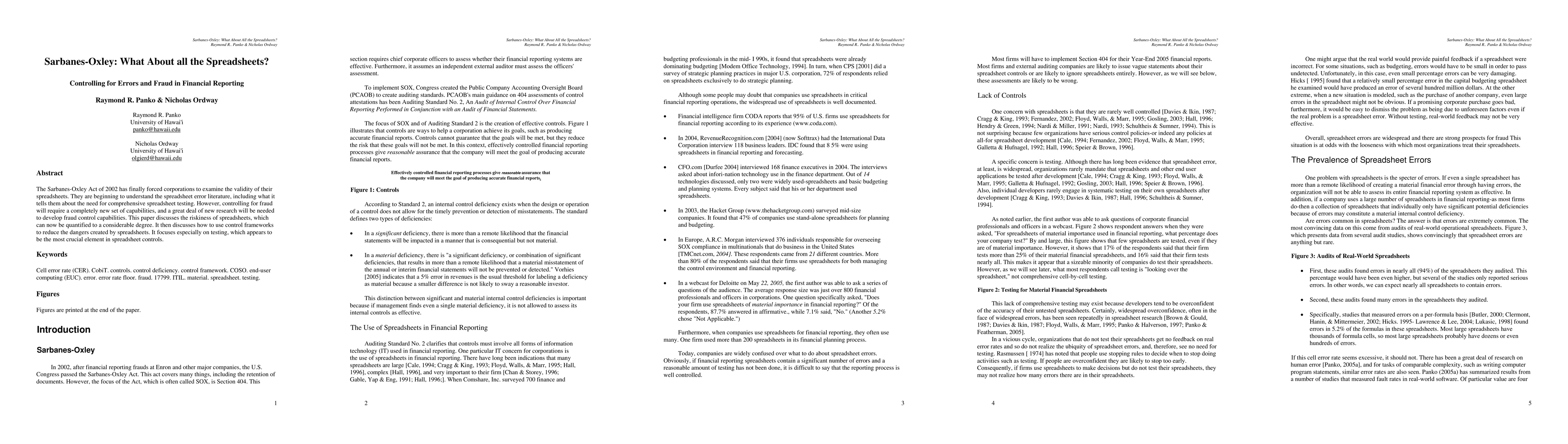 The Sarbanes-Oxley Act has prompted corporations to scrutinize spreadsheet validity, highlighting the need for comprehensive testing. Control frameworks and testing are crucial in mitigating risks and preventing fraud, necessitating further research to develop effective fraud control measures.