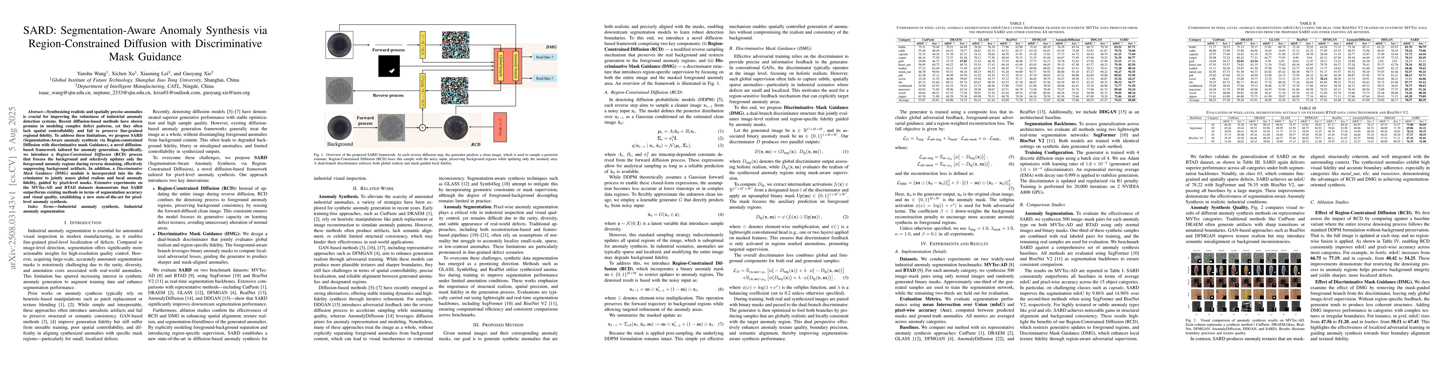 Synthesizing realistic and spatially precise anomalies is essential for enhancing the robustness of industrial anomaly detection systems. While recent diffusion-based methods have demonstrated strong capabilities in modeling complex defect patterns, they often struggle with spatial controllability and fail to maintain fine-grained regional fidelity. To overcome these limitations, we propose SARD (Segmentation-Aware anomaly synthesis via Region-constrained Diffusion with discriminative mask Guidance), a novel diffusion-based framework specifically designed for anomaly generation. Our approach introduces a Region-Constrained Diffusion (RCD) process that preserves the background by freezing it and selectively updating only the foreground anomaly regions during the reverse denoising phase, thereby effectively reducing background artifacts. Additionally, we incorporate a Discriminative Mask Guidance (DMG) module into the discriminator, enabling joint evaluation of both global realism and local anomaly fidelity, guided by pixel-level masks. Extensive experiments on the MVTec-AD and BTAD datasets show that SARD surpasses existing methods in segmentation accuracy and visual quality, setting a new state-of-the-art for pixel-level anomaly synthesis.