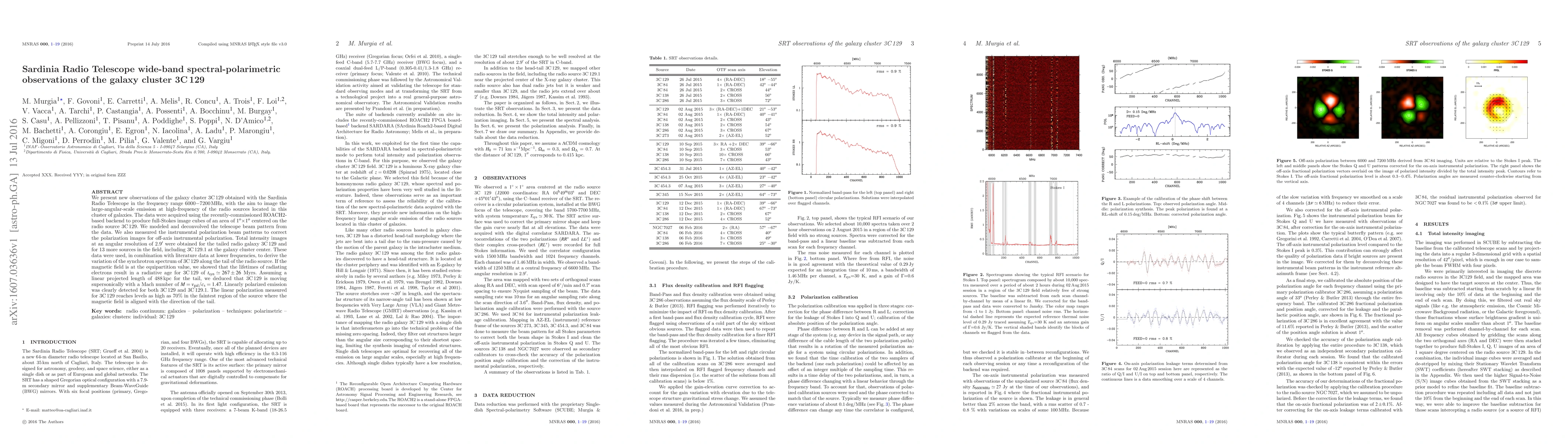 This study uses the Sardinia Radio Telescope to obtain high-frequency spectral-polarimetric observations of galaxy cluster 3C 129, revealing detailed synchrotron spectra and high-polarization levels in the radio sources, indicating supersonic motion of the galaxy.